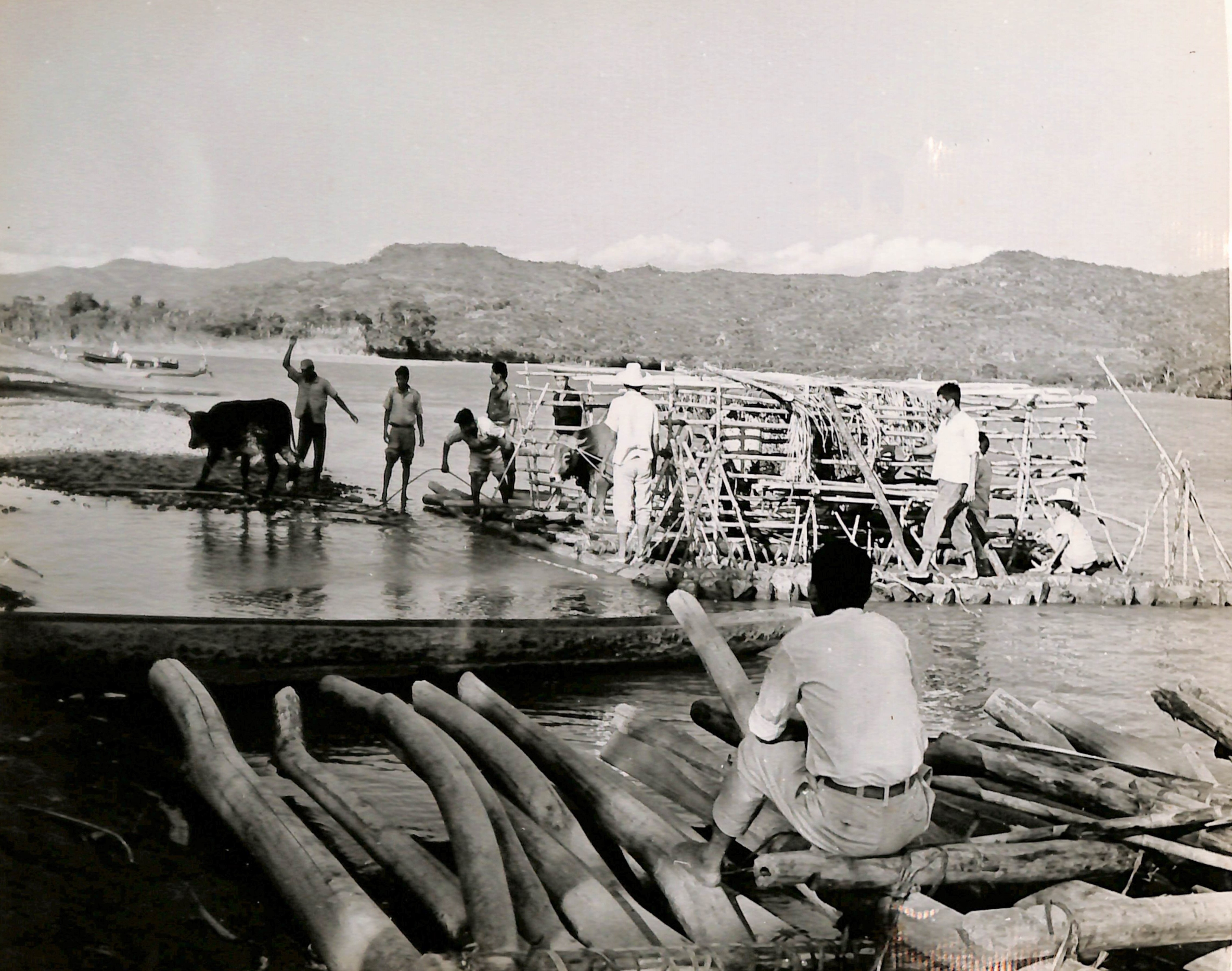 En la fotografía se aprecia en el río un típico transporte de ganado vacuno.
