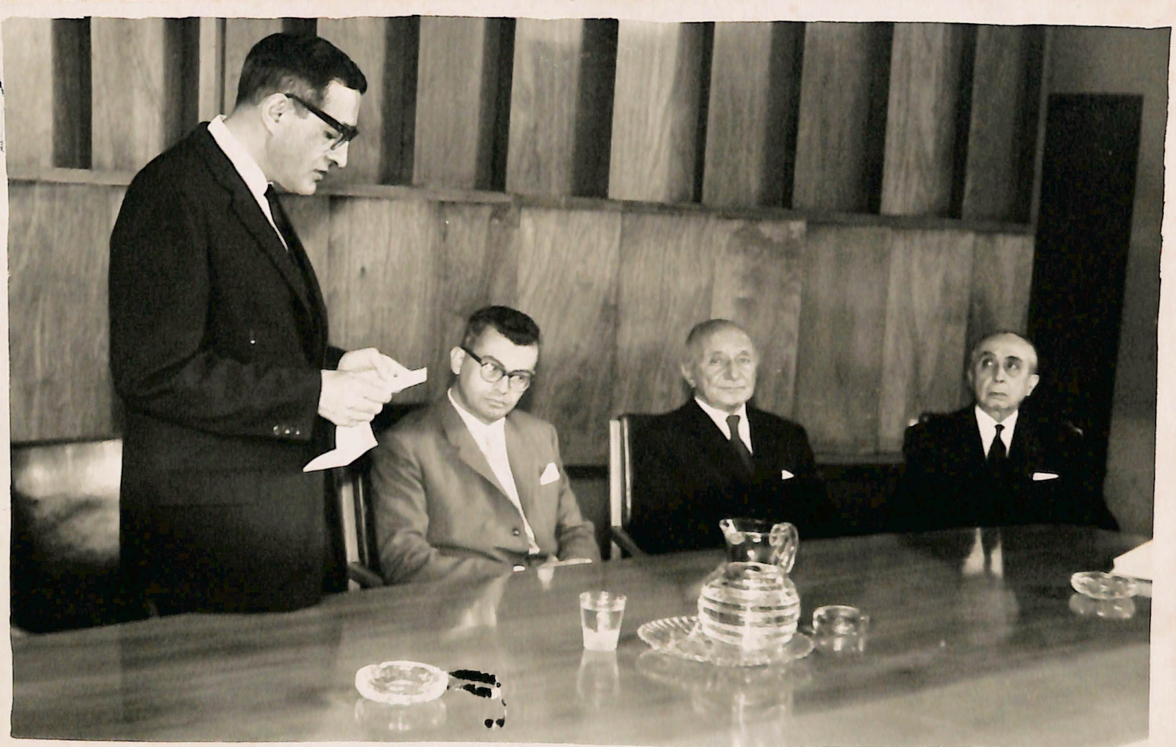 En la fotografía se aprecia de derecha a izquierda sentados: Dr. Honorio Delgado, Dr. Juan Francisco Valega, y el Dr. Javier Arias Stella de pie leyendo aparentemente un discurso el Dr. Emilio Majluf.
