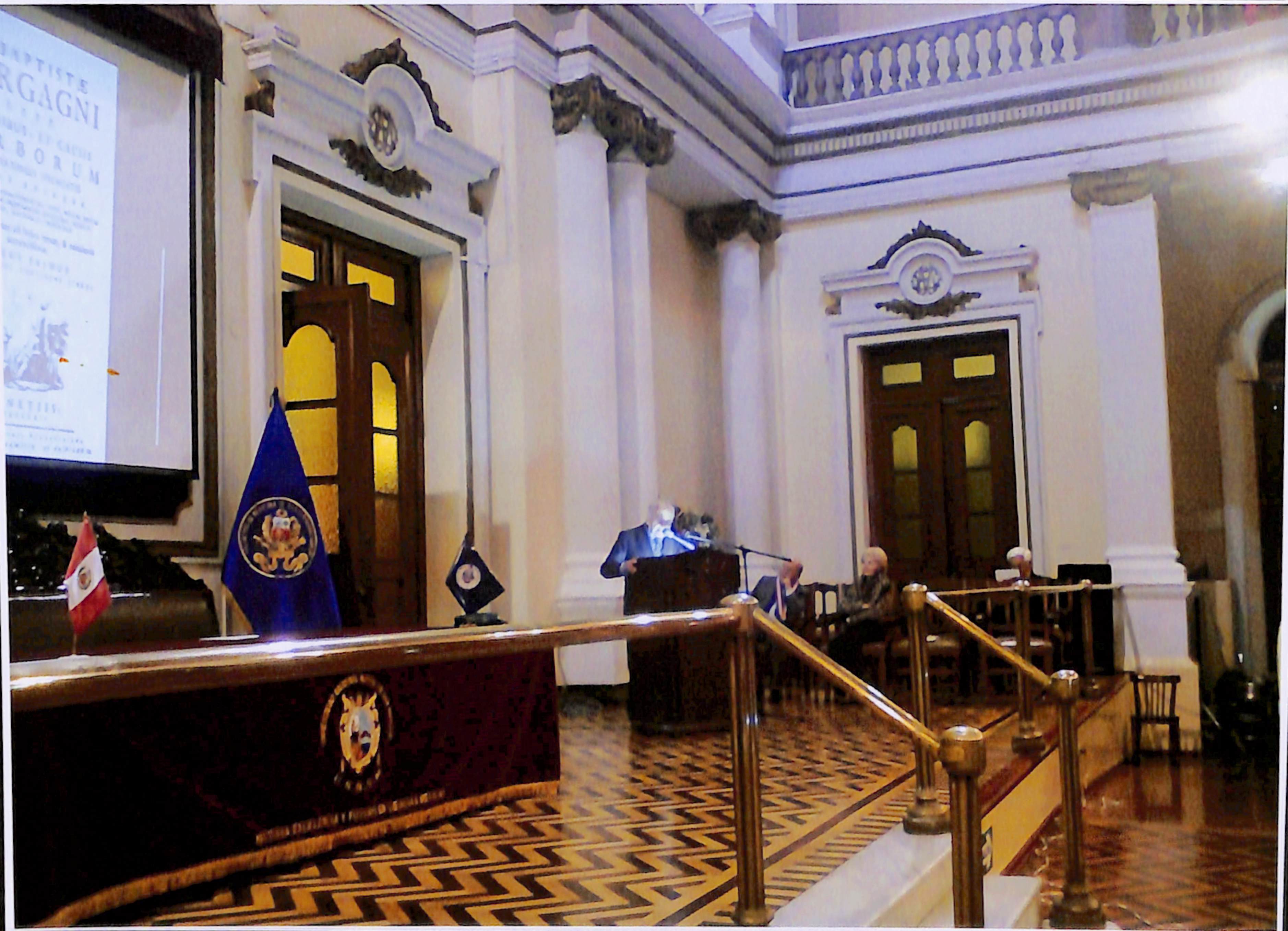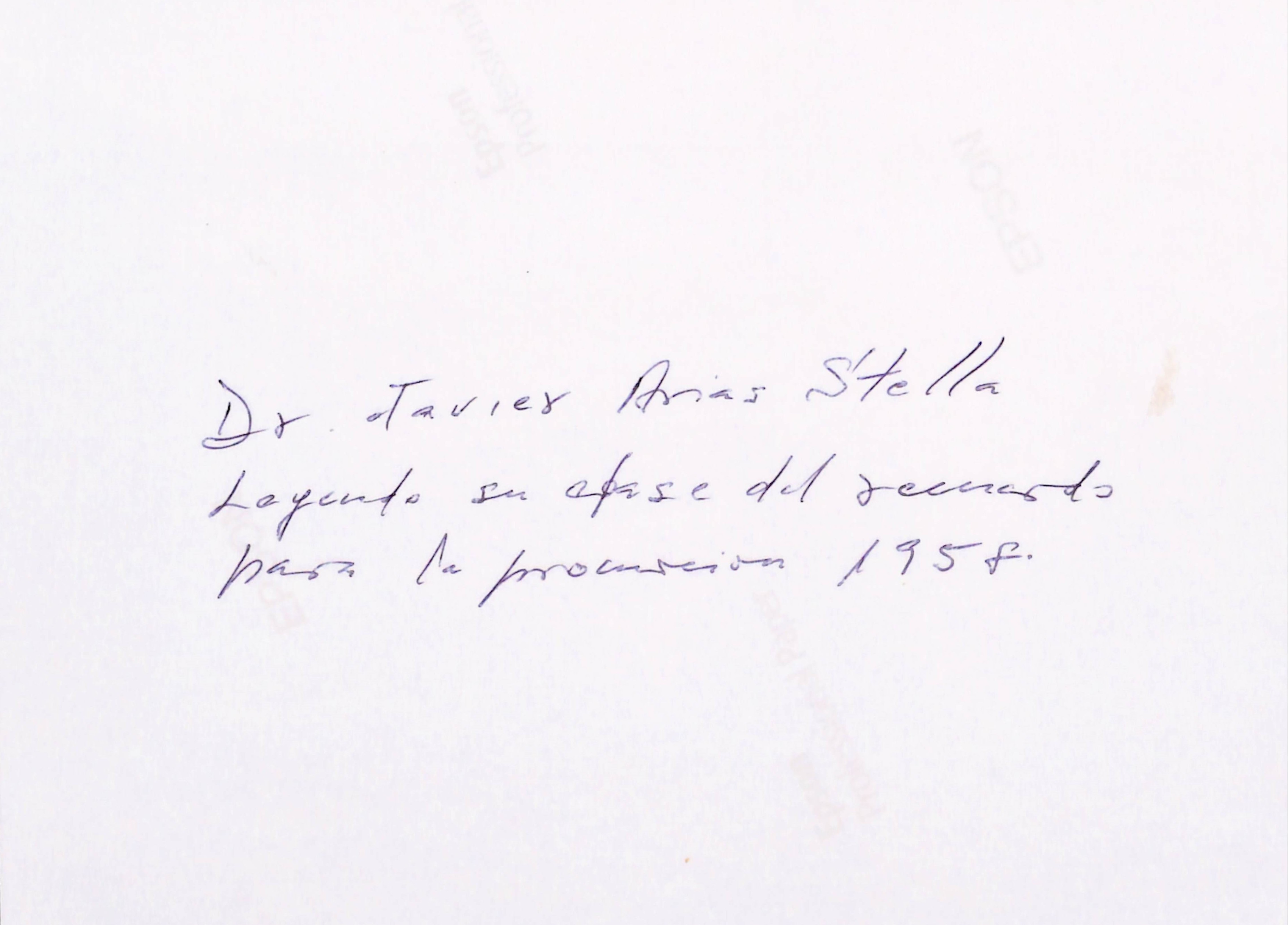 En el reverso lleva escrito: "Dr. Javier Arias Stella, leyendo su clase del recuerdo para la promoción 1958."