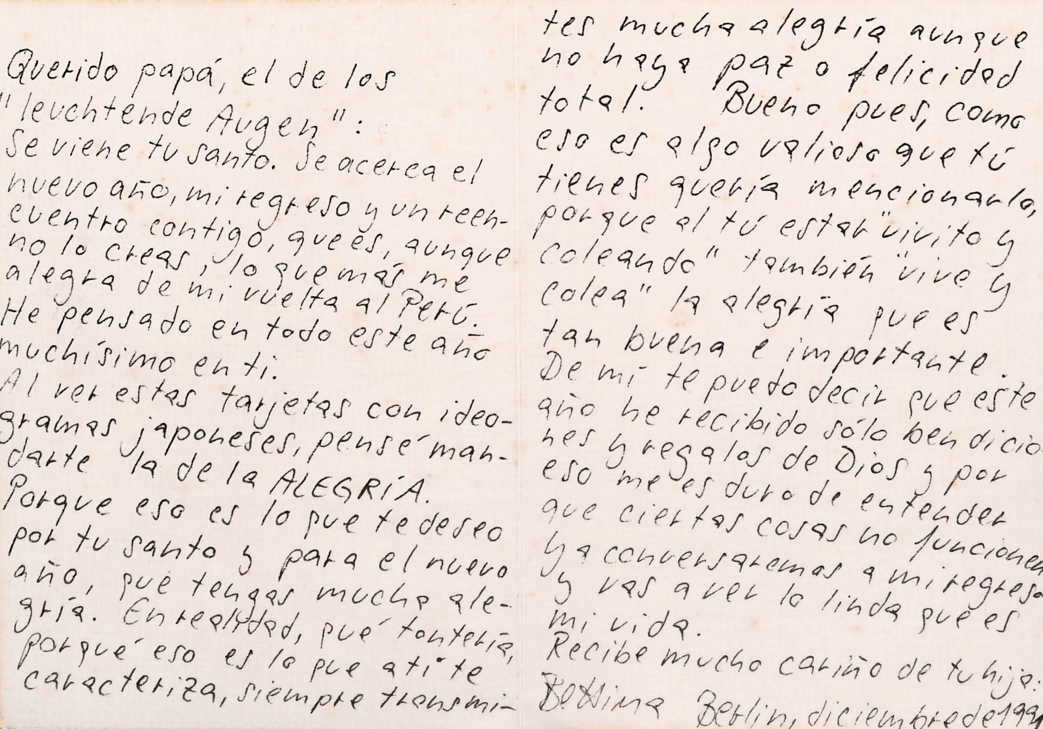 Postal que indica: Querido papá, el de los "leuchtende Augeh": se viene tu santo. Se acerca el nuevo año, mi regreso y un reencuentro contigo, que es, aunque no lo crees, lo que más me alegra de mi vuelta al Perú. He pensado en todo este año muchísimo en ti. Al ver estas tarjetas con ideogramas japoneses, pensé mandarte la de la ALEGRÍA. Porque eso es lo que pues te deseo por tu santo y para el nuevo año, que tengas mucha alegría. En realidad, pué tontería, porqué eso es la pue a ti te caracteriza, siempre transmites mucha alegría aunque no haya paz o felicidad total. Bueno pues, como es algo valioso que tú tienes quería mencionarlo, porque al tú estar " vivito y coleando" también "vive y colea" la alegría pues es tan buena e importante. Demi te puedo decir que este año he recibido solo bendiciones y regalos de Díos y por eso me es duro entender que ciertas cosas no funcionen. Ya conversaremos a mi regreso y vas a ver lo linda que es la vida. Reciebe mucho cariño de tu hija Bettina. Berlin, diciembre de 1991