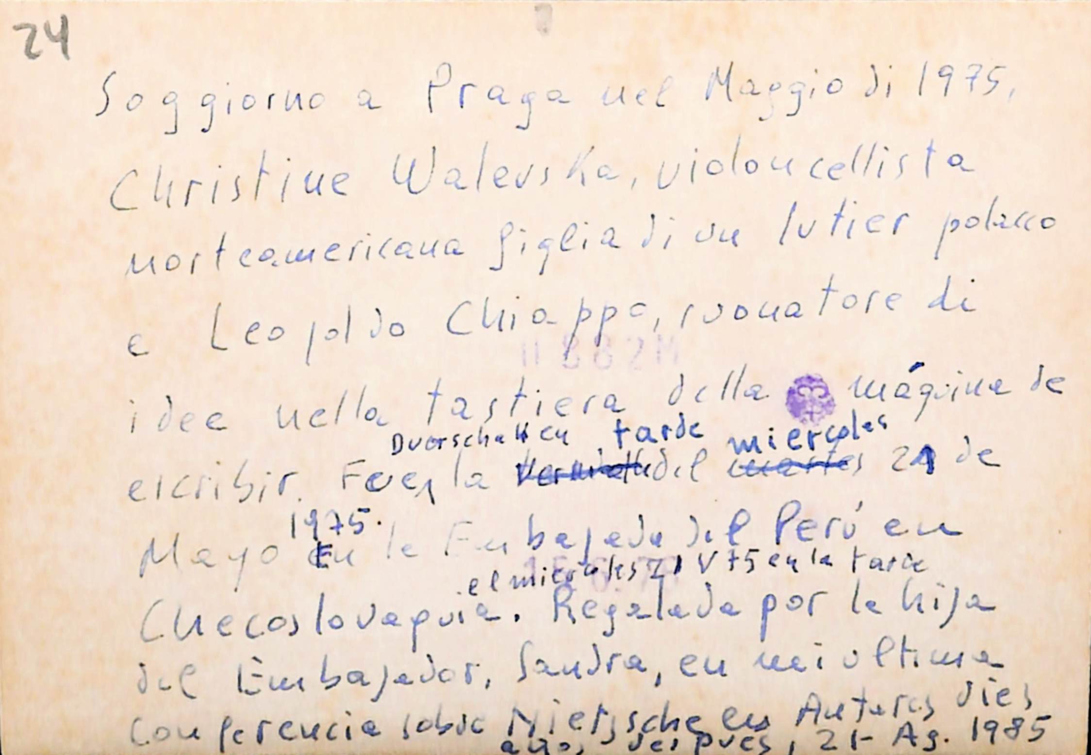 Fotografía que indica: Soggiorno a Praga di 1975, Christine Walevska, violoncellista norteamericana giglia di su lutier polacco e Leopoldp Chiappo, portatore di idee vuelta tastiera de la maquine de escribir . Fourcduerschlleu tarde miercoles 21 de mayo 1975 en le Embajada del Perú en Cuecoslovepuie regalada por le hija del Embajador, Sandra, en miu ultima conferenia sobre Nietzsche en Asturas diez años después, 21 - ag. 1985.