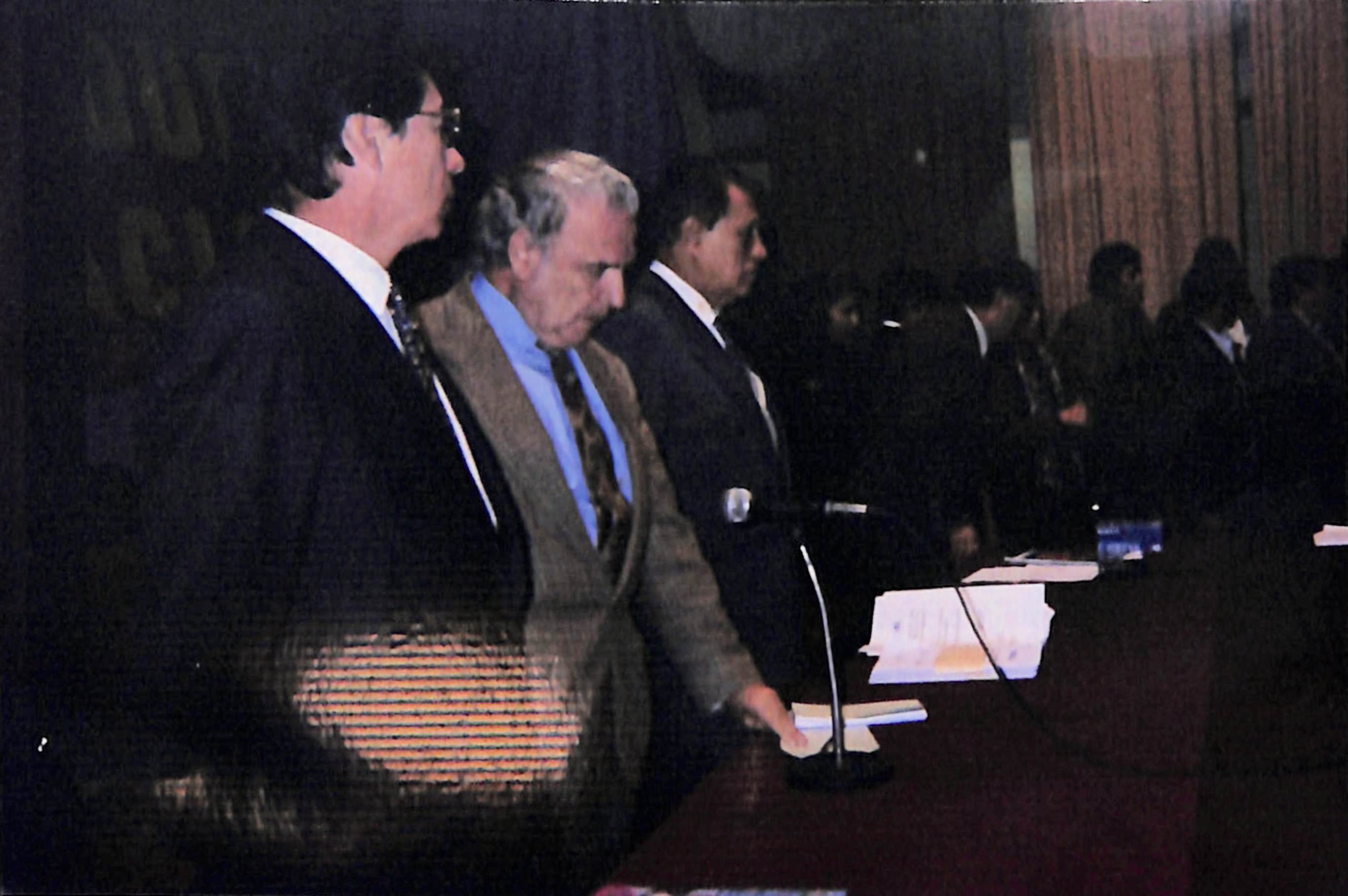 Fotografía en la que se aprecia de pie al Dr. Roger Guerra-García, en la parte posterior señala: encuentro de UPP en Puno, abril 24 de 1999. En el teatro Municipal con Daniel Estrada.