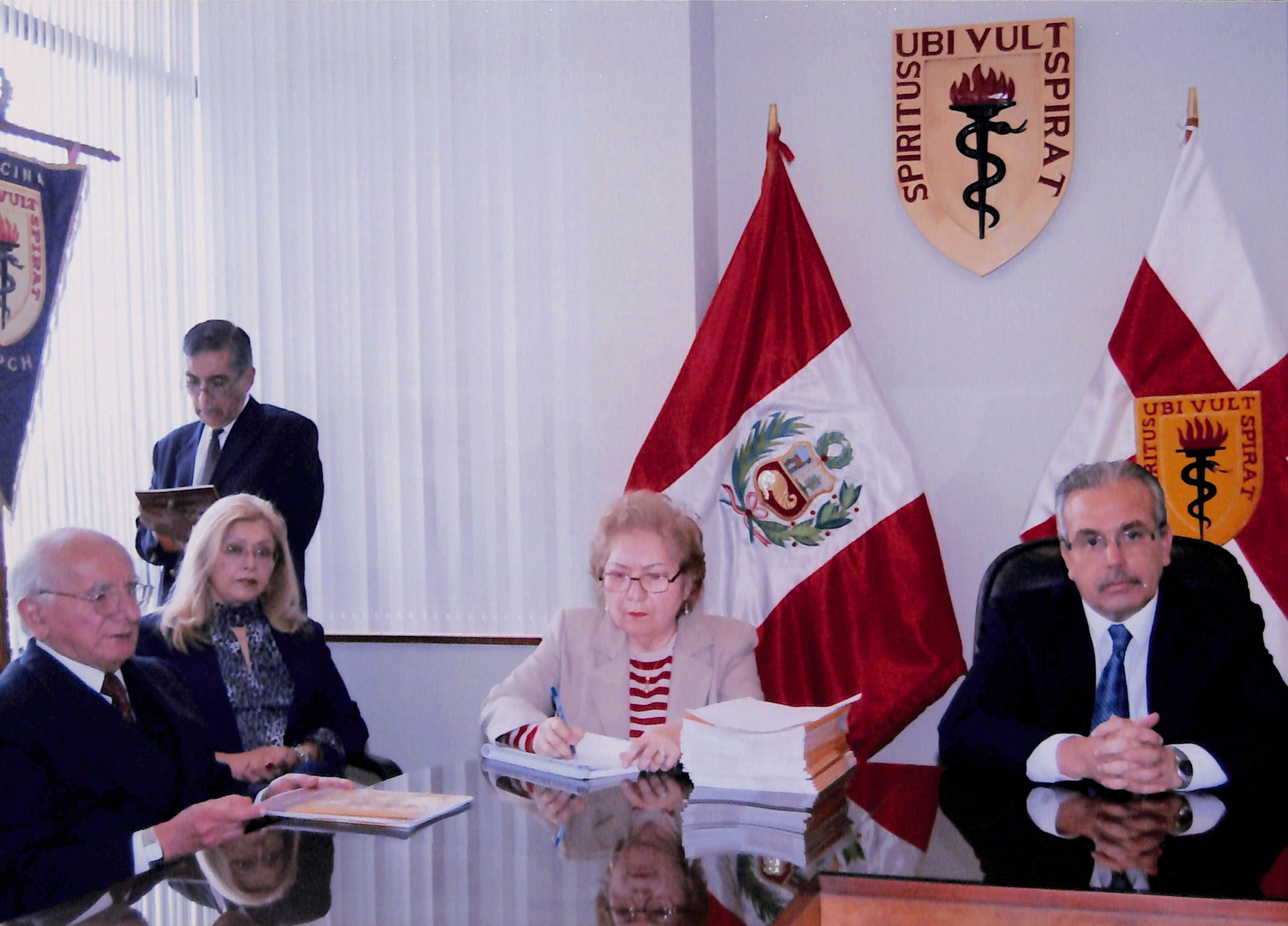 Se aprecia al Dr. Luis Caravedo Reyes en la sala de juntas del decanato de medicina junto a dos mujeres no identificadas, en el marco del XXV Aniversario del fallecimiento del Dr. Alberto Hurtado, en la Facultad de Medicina de la Universidad Peruana Cayetano Heredia