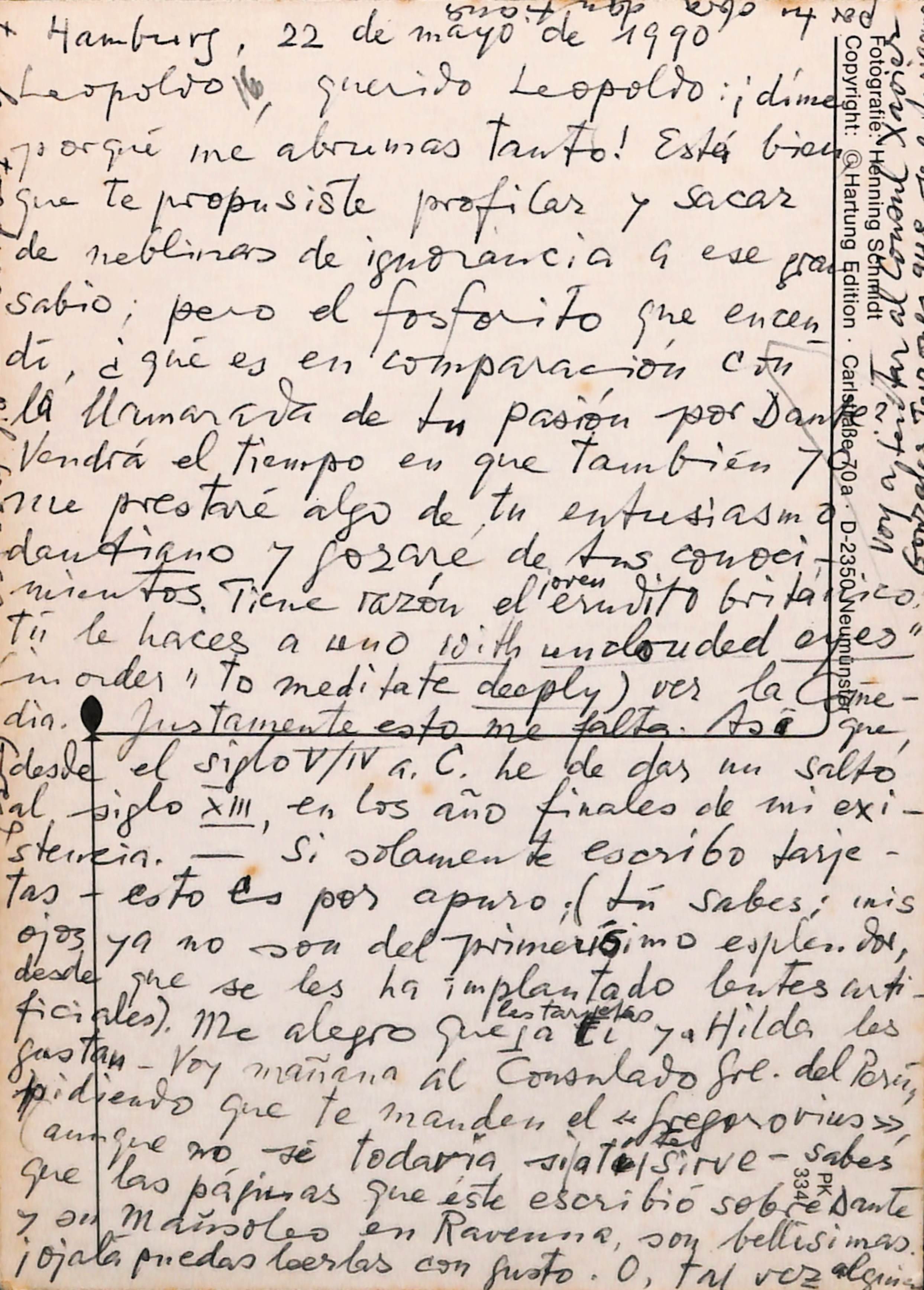 Postal que indica: Hamburg, 22 de mayo de 1990. Leopoldo, querido Leopoldo, ¡dime porqué me abusas tanto! Está bien que te propusiste profilar y sacar de neblinas de ingnorancia a ese gran sabio; pero el fosforito que me encendí, ¿qué es en comparación con la llamerada de tu pasión por Dante? Vendrá el tiempo en que también yo me prestaré algo de tu entusiasmo dantiano y forzaré de inconocimiento. Tiene razón el joven erudito británico: tú le haces a uno "with unclouded eyes in order to meditate deeply" Ver la Comedia, justamente esto me falta. Así que desde el siglo V/IV a.c he de dar un salto al sihlon XIII, en los años finales de mi existencia. Si solamente escribo tarjetas, esto es por apuro (tú sabes mis ojos ya no son del primerísimo esplendor desde que se le han implantado lentes artificiales). Me alegra que las tarjetas a ti y a Hilda les gustan. Voy mañana al consulado General de Perú, pidiendo que te manden el "Gregorovius" aunque no sé todavía si ati te sirve. Sabes que las páginas que este escribió sobre Dante y su mausoleo en Ravenna son bellísimas ¡Ojalá puedas leerlas con gusto o tal vez alguien te las puede traducir. Greg