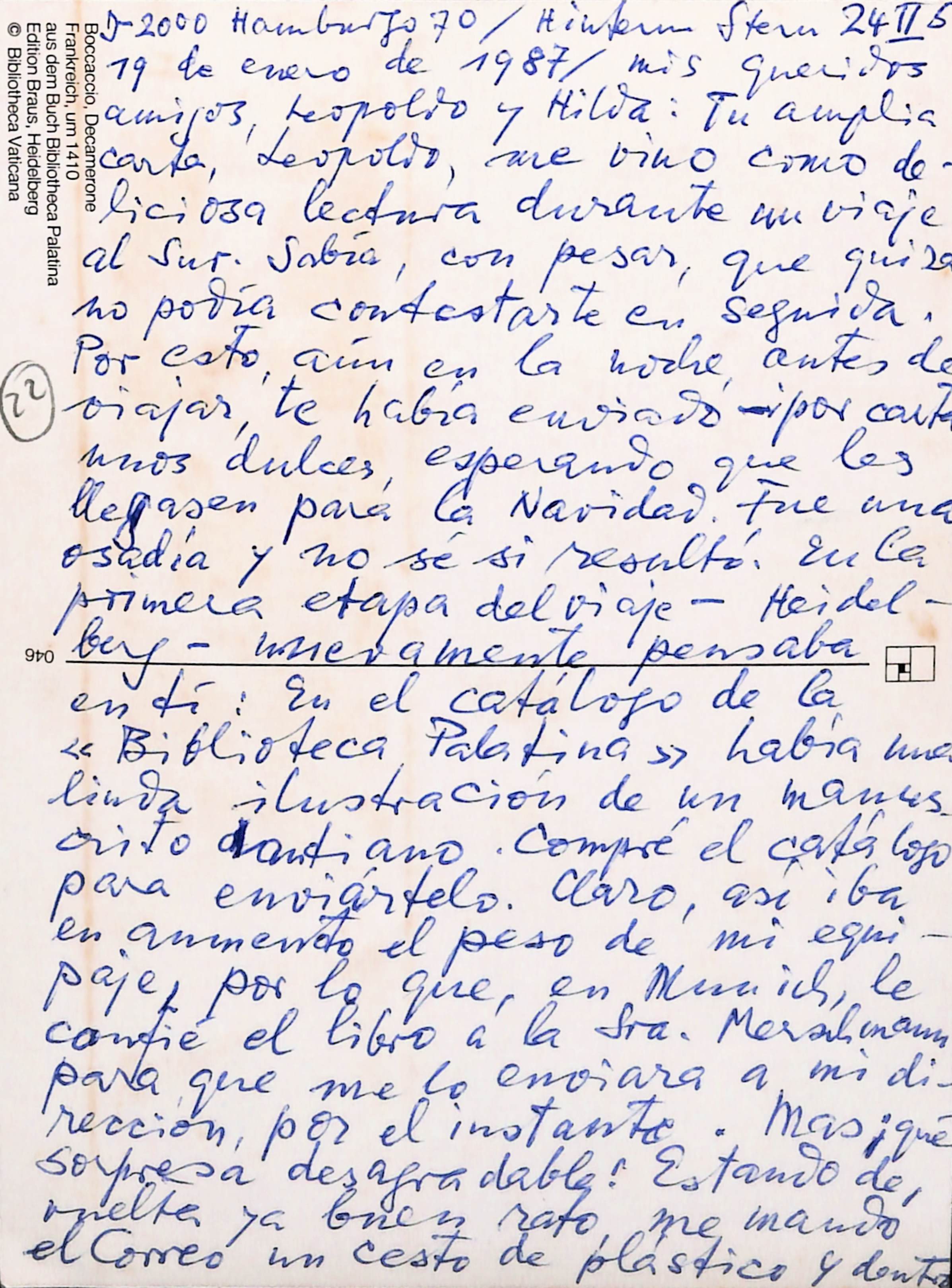 Postal que indica: D-2000 Hamburgo 70/ Hinbun Steru 24 II 5 / 19 de enero de 1987 / Mis queridos amigos Leopoldo y Hilda: tu amplia carta Leopoldo me vino como deliciosa lectura durante mi viaje al sur. Sabía con pesar, que quizá no podría contestarte en seguida. Por eso aún en la noche antes de viajar te habría enviado - por carta menos dulce, esperando que les llegasen para la Navidad. Fue una osadía y no sé si resultó en la primera etapa del viaje - Heidelberg - nuevamente pensaba en ti: en el catálogo de la 2Biblioteca Palatina" había una linda ilustración de un manuscrito dantiano. Compré el catálogo para enviartelo, claro aspi iba aumentando el peso de mi equipaje , por lo que en Munich, le confié el libro a la Sra. Mersilinam para que me lo enviara a mi dirección, por el instante. Mas ¡qué sorpresa desagradable! estando de vuelta ya buen rato me mandó el correo en un cesto de plástico y dentro