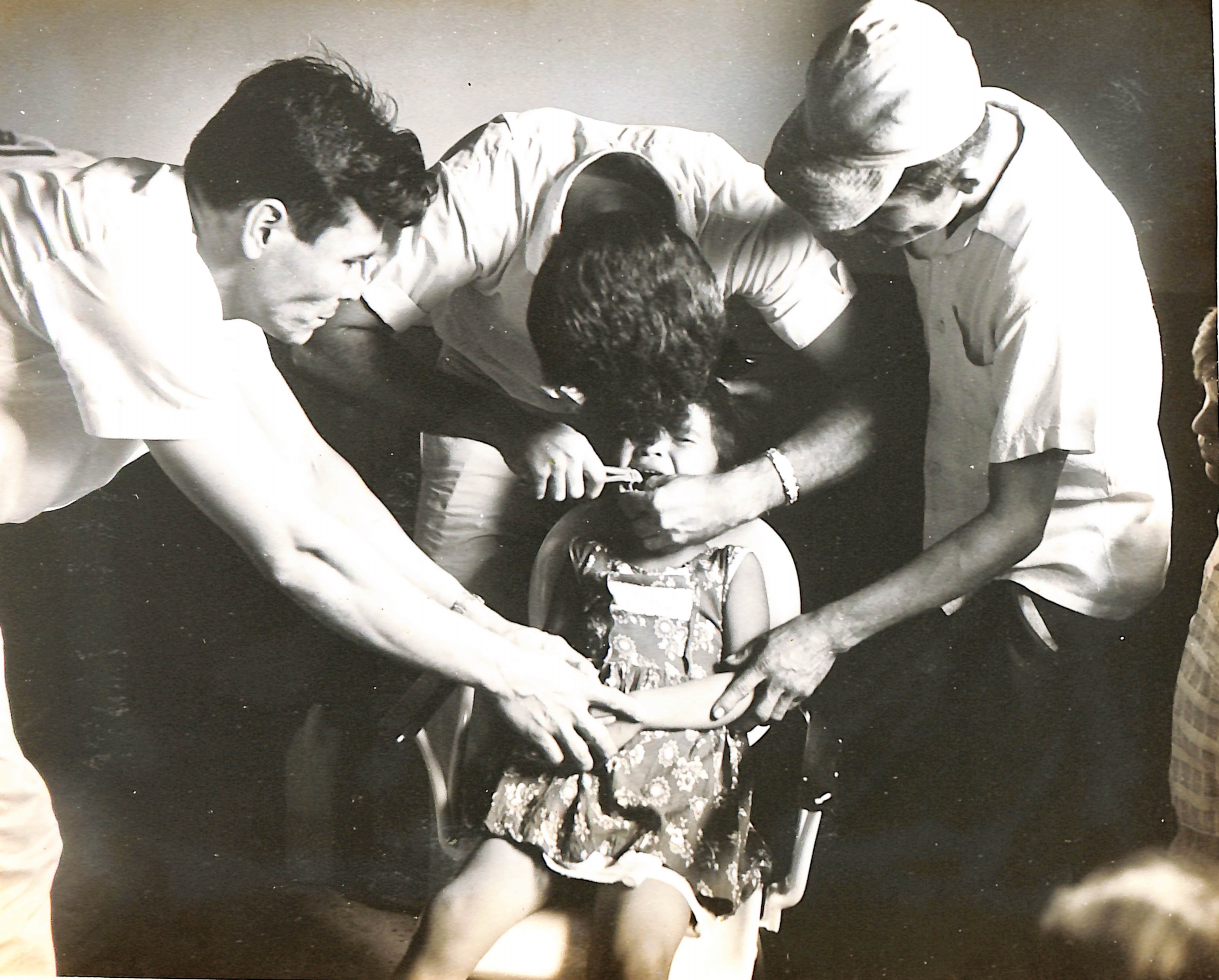 En la fotografía se aprecia al Dr. Augusto Jarama realizando una extracción dental a una niña.