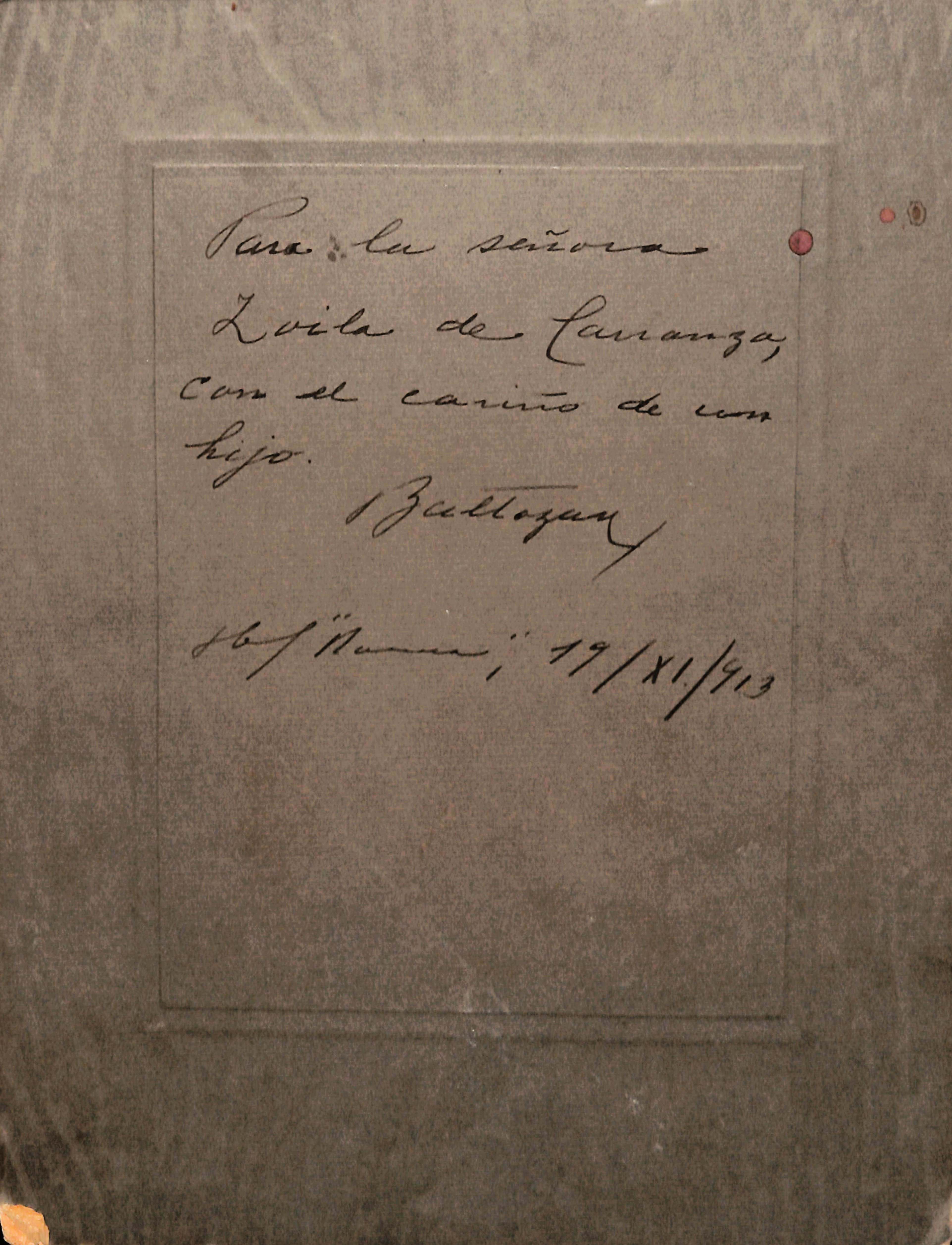 En el reverso indica: "Para la señora Zoila de Carranza con el cariño de un hijo. Baltazar. Hosp "N…", 19/ XI/913"