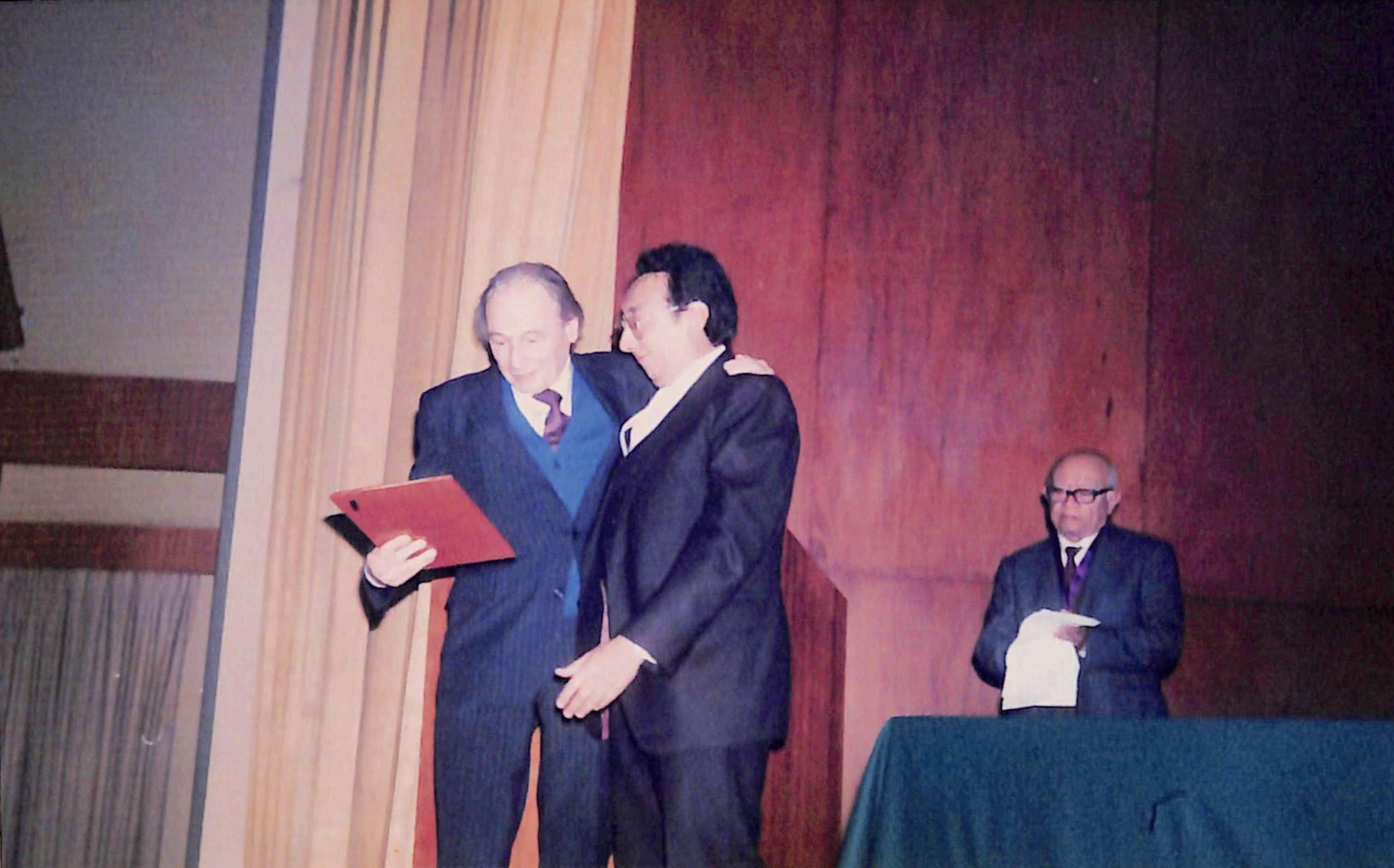 En la fotografía se aprecia en primer plano al Dr. Carlos Monge abrazando al Dr. Gustavo Gonzales, en un segunda plano se aprecia al Dr. Enrique Fernandez.