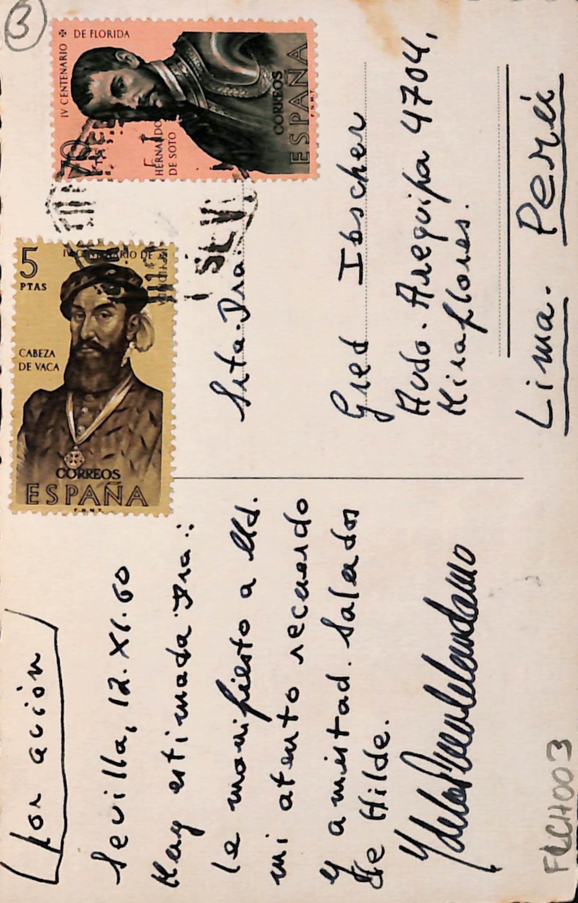 La postal reseña: Sevilla, 12 XI, 60 …Estimada Dra: le manifiesto a ud. Mi atento recuerdo y amistad. Saludos de Hilde.