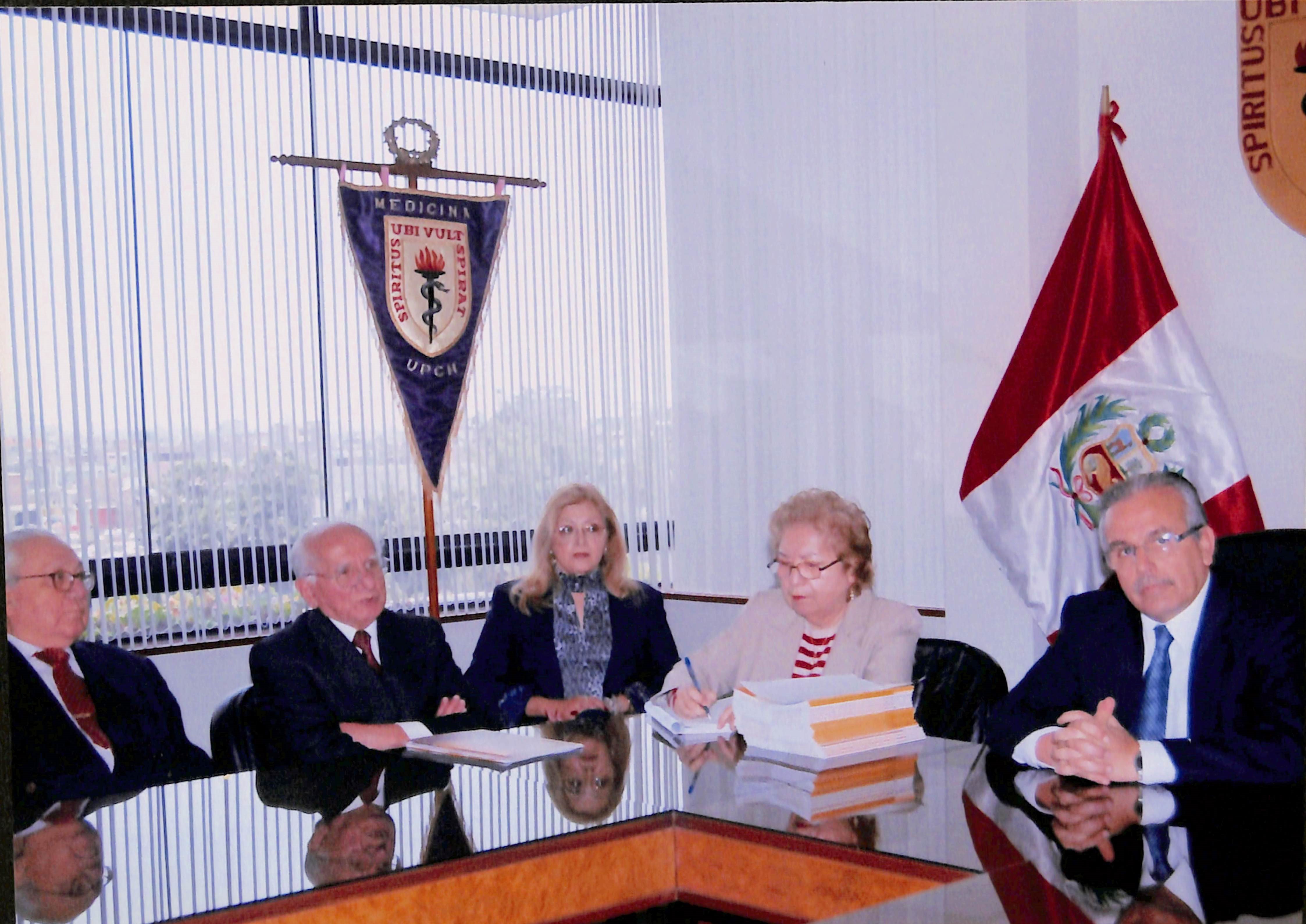 En los extremos de la fotos se reconoce al Dr. Amador Carcelen y Dr. Luis Caravedo, en el marco del XXV Aniversario del fallecimiento del Dr. Alberto Hurtado, en la Facultad de Medicina de la Universidad Peruana Cayetano Heredia