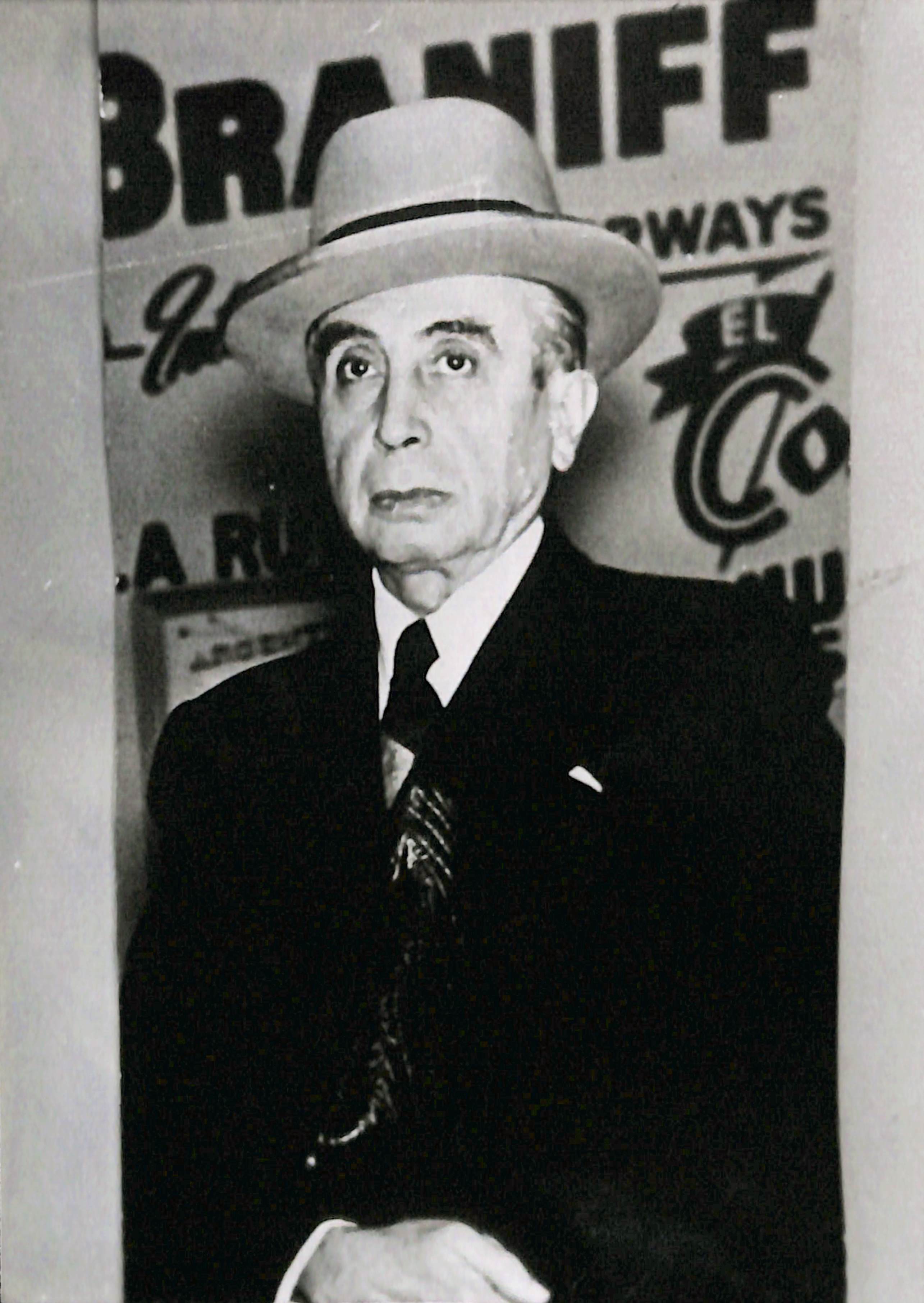 Dr. Honorio Delgado en el frontis de la oficina de Braniff International Airways, una aerolínea estadounidense que existió desde 1928 hasta 1982.