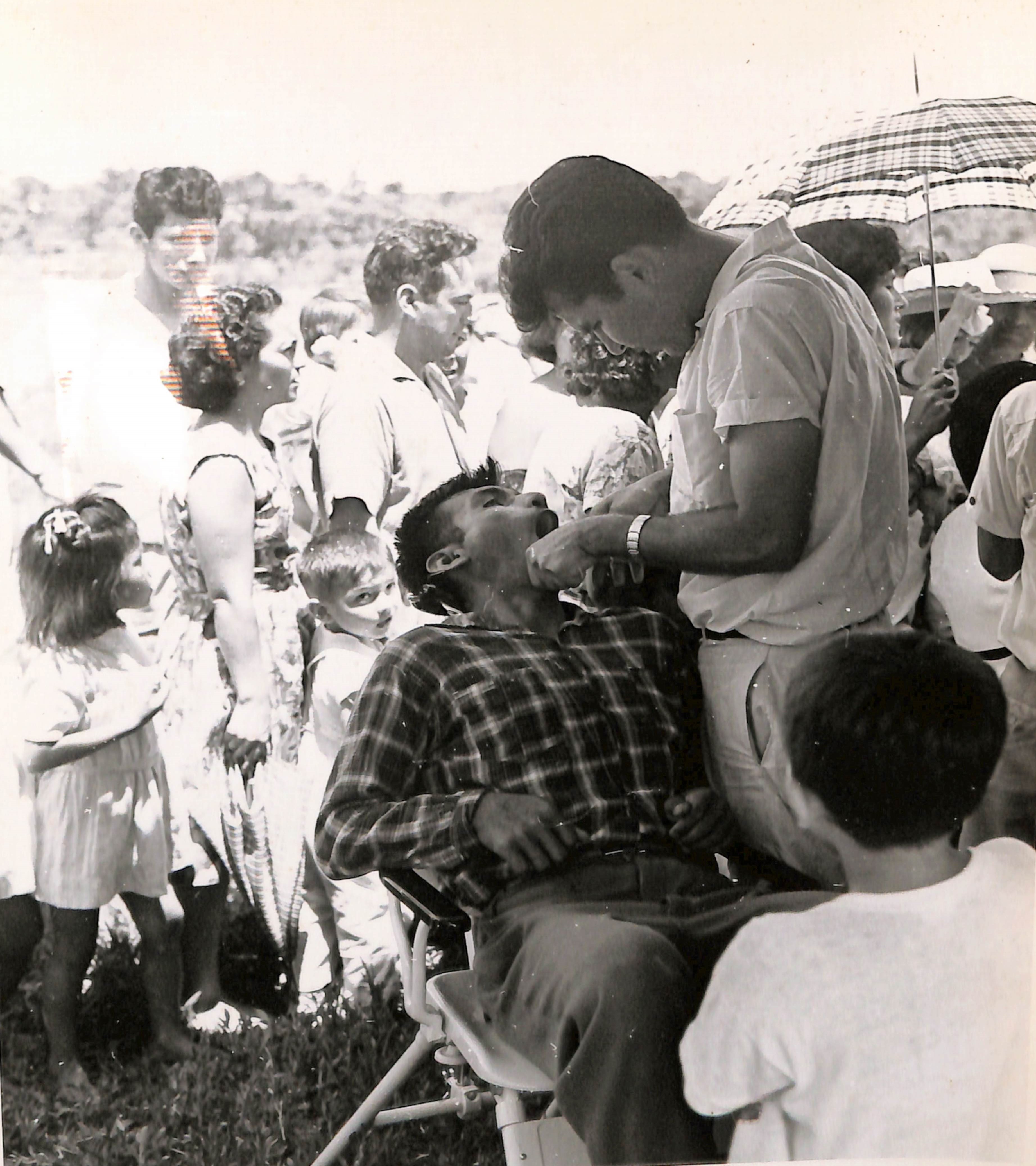 En primer plano se aprecia al Dr. Augusto Jarama realizando una extracción dental.