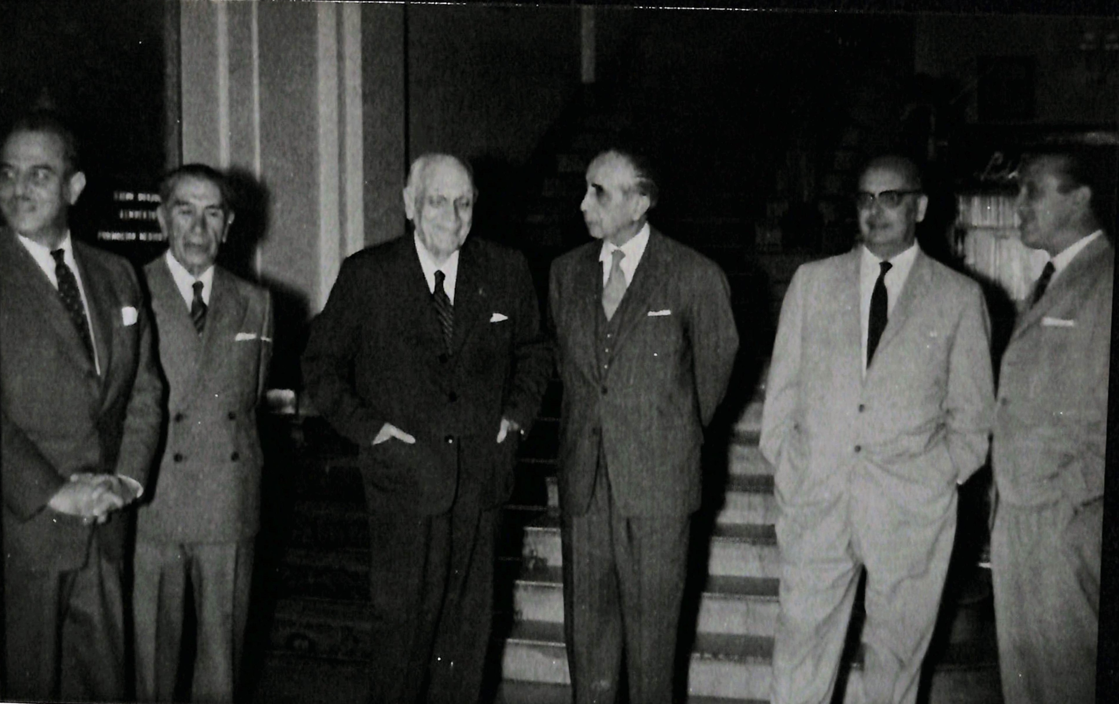 Dr. Honorio Delgado en un salón de reuniones, a su lado izquierdo el Dr. Alberto Hurtado.