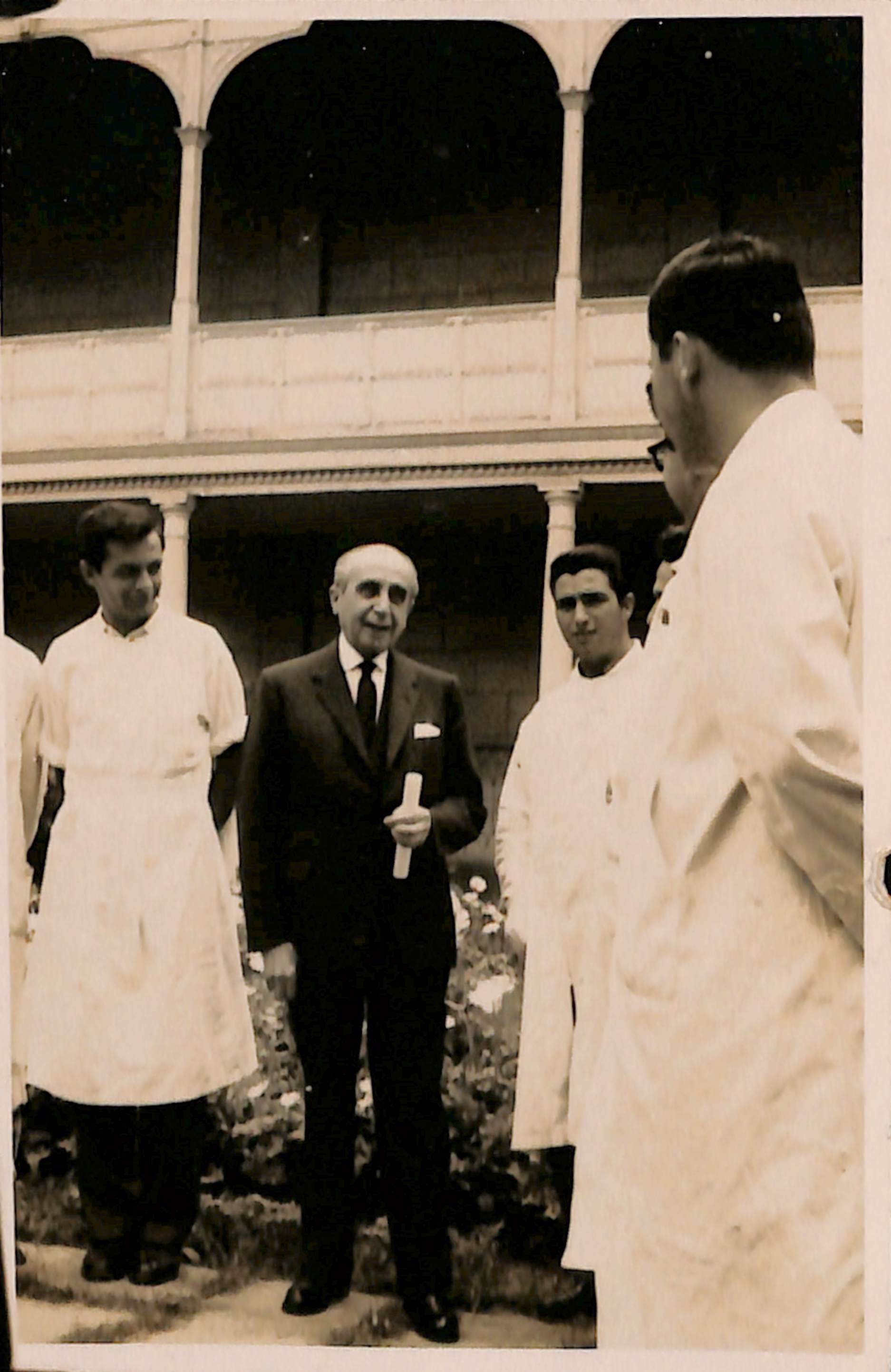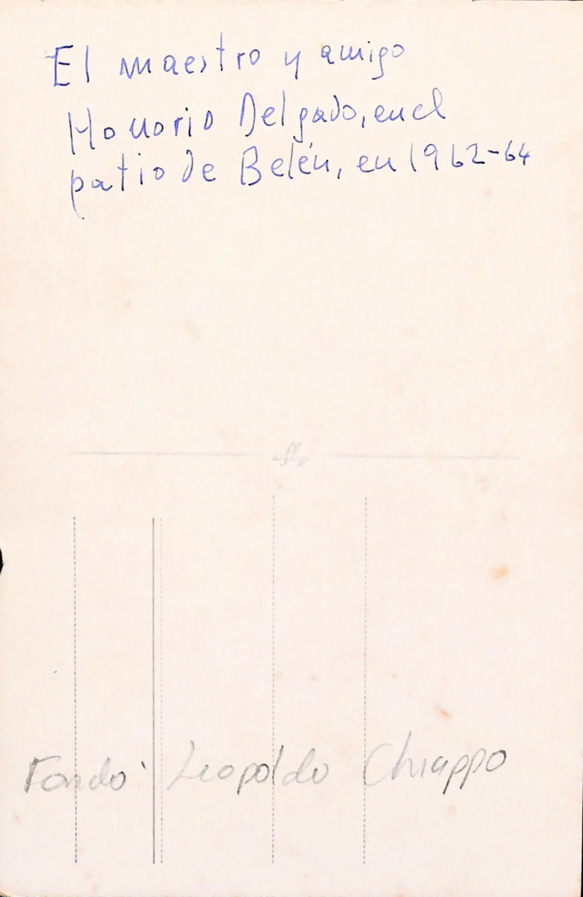 En la foto se aprecia al Dr. Honorio Delgado en el patio del local de Jr. Belén, en el reverso indica: "El maestro y amigo Honorio Delgado, en el patio Belén, en 1962-1964."