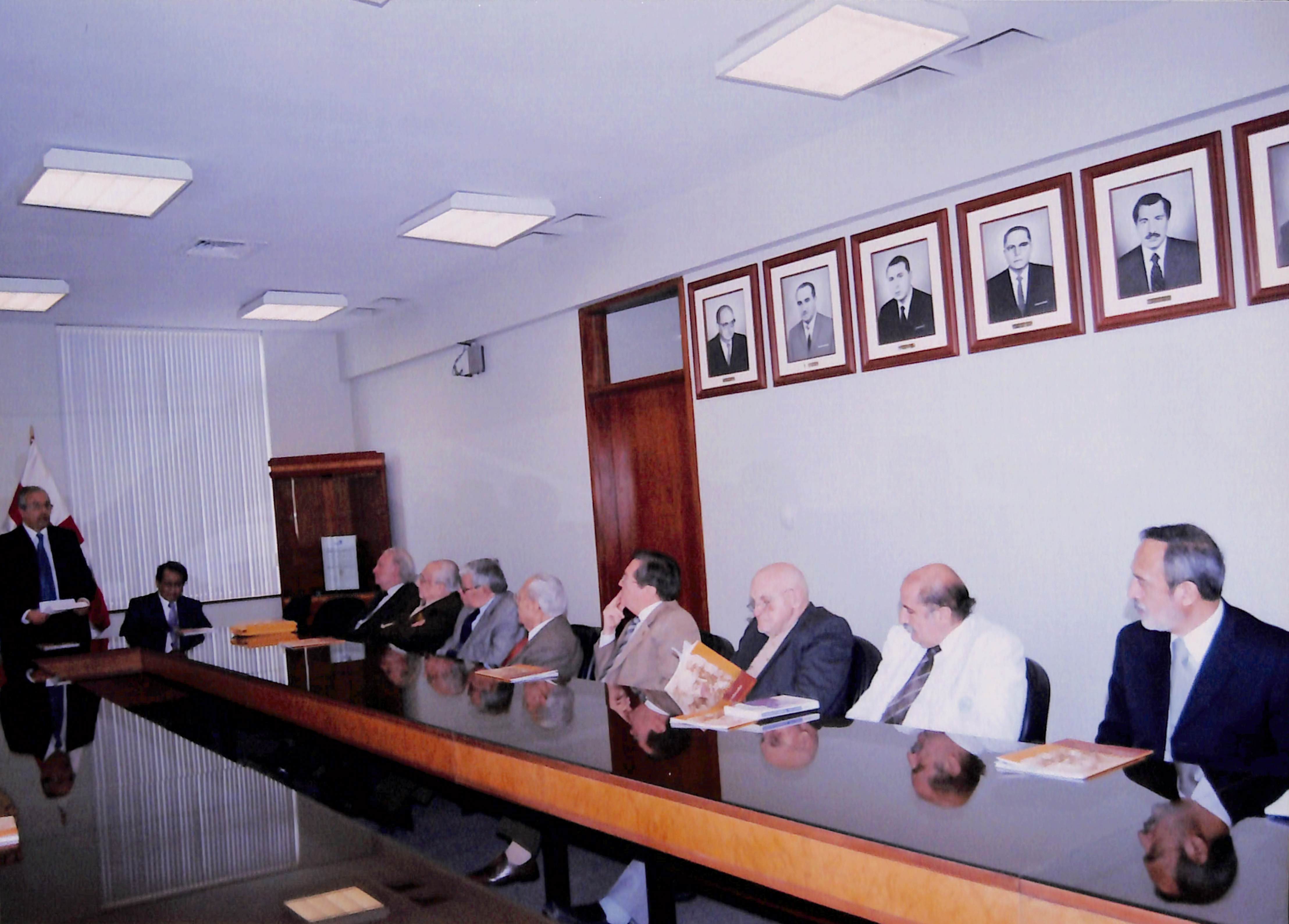 El Dr. Luis Caravedo de pie dando un discurso ante el pleno de la cátedra de medicina y el consejo de facultad, en el marco del XXV Aniversario del fallecimiento del Dr. Alberto Hurtado, en la Facultad de Medicina de la Universidad Peruana Cayetano Heredia