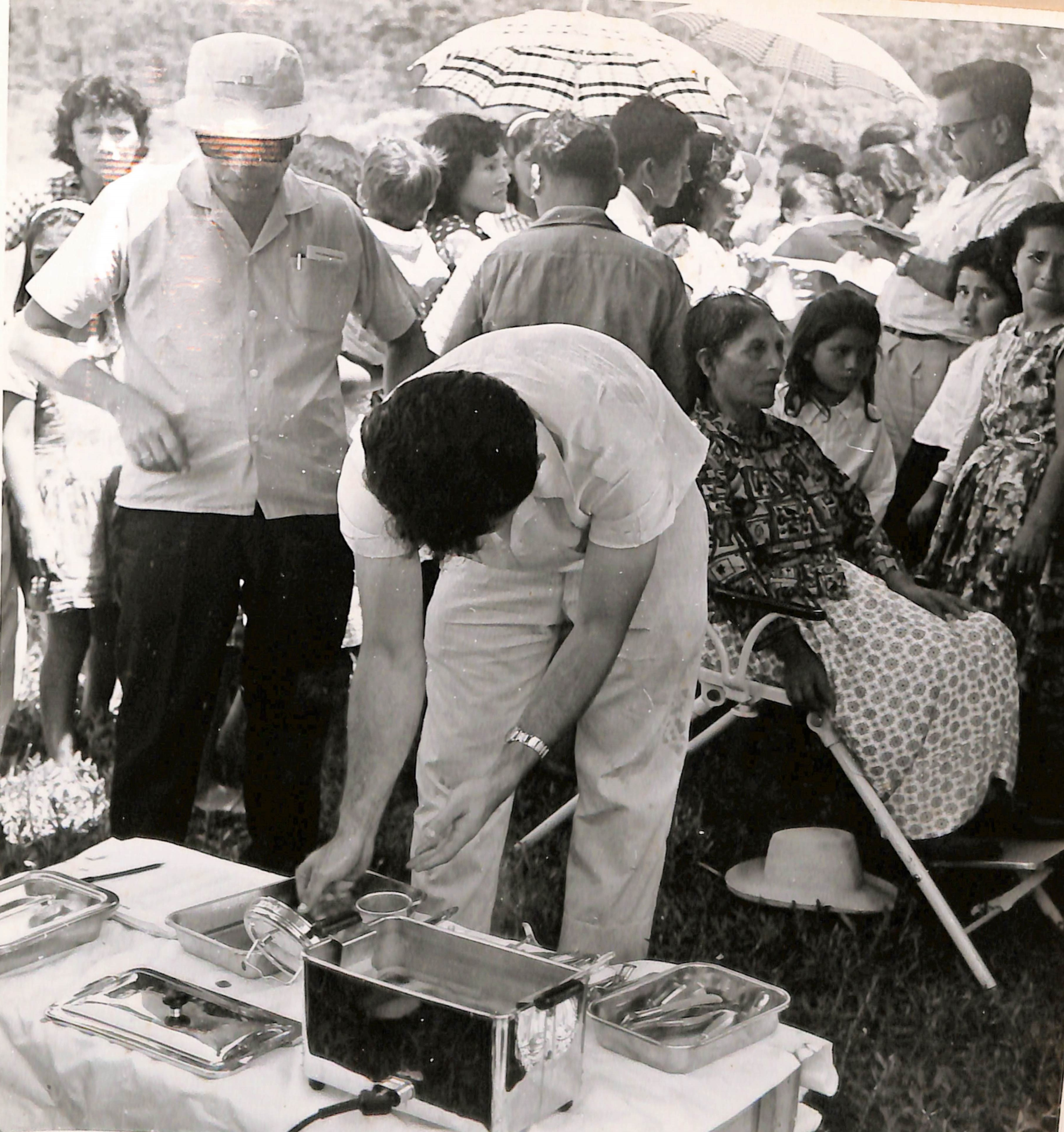 En la imagen se aprecia agachado al Dr. Augusto Jarama esterilizando su equipo dental antes de empezar a atender a la población de Bellavista.