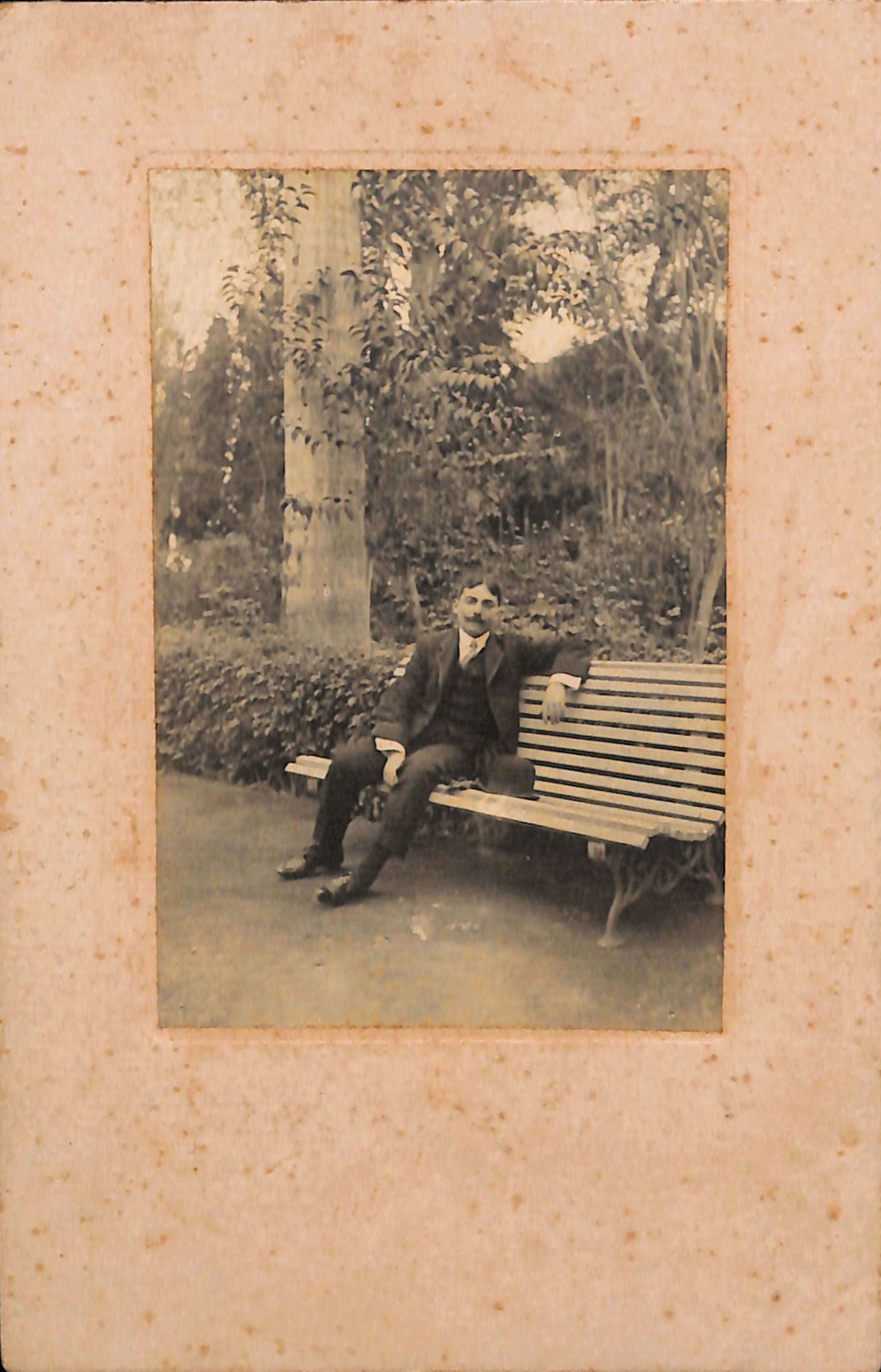 Un joven Dr. Baltazar Caravedo sentado en la banca de un parque