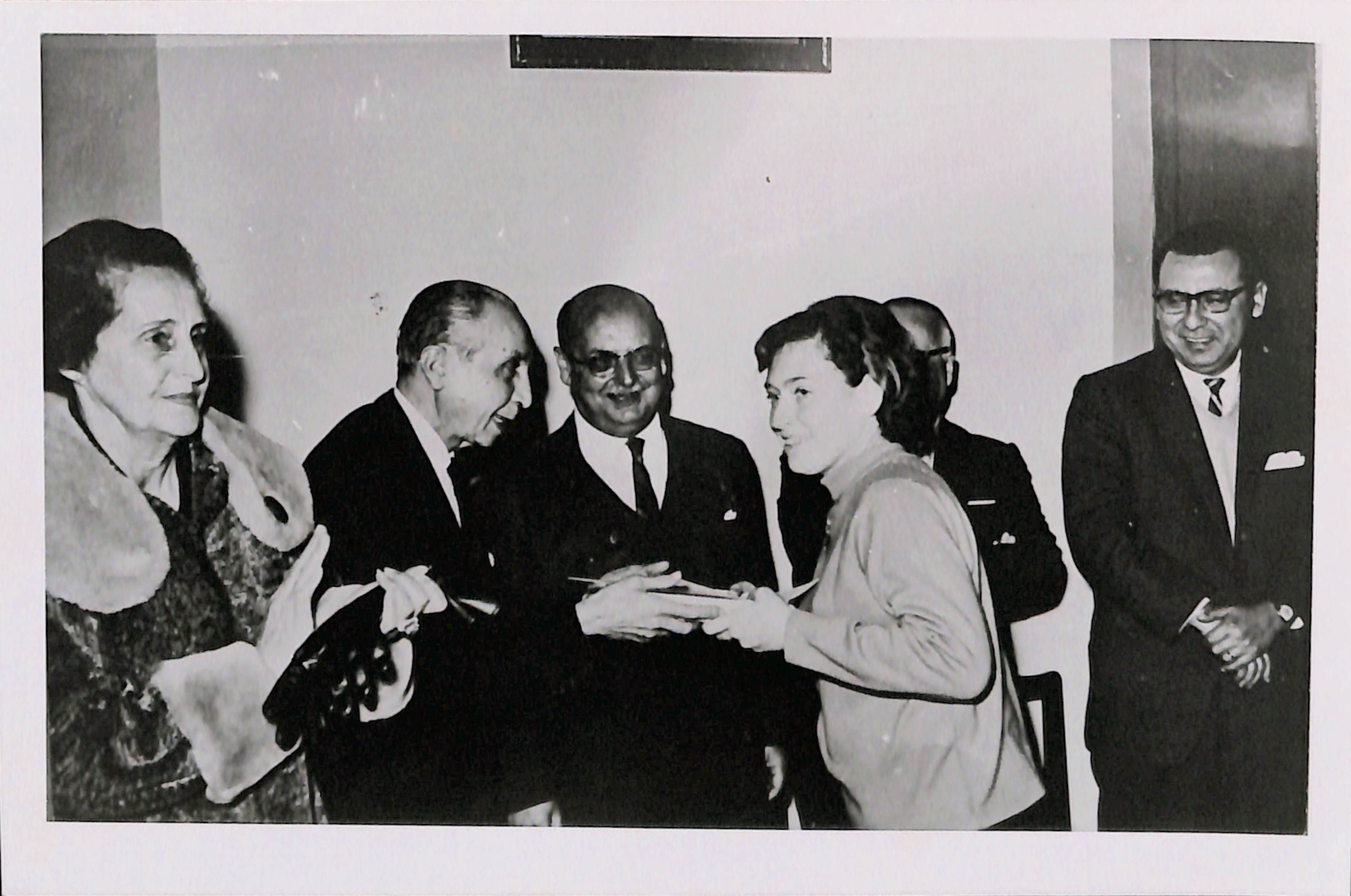 En la fotografía se reconoce al Dr. Honorio Delgado en un salón de reuniones saludando a la Dra. Graciela S. De Alarcón, a su lado izquierdo el Dr. Alberto Hurtado.