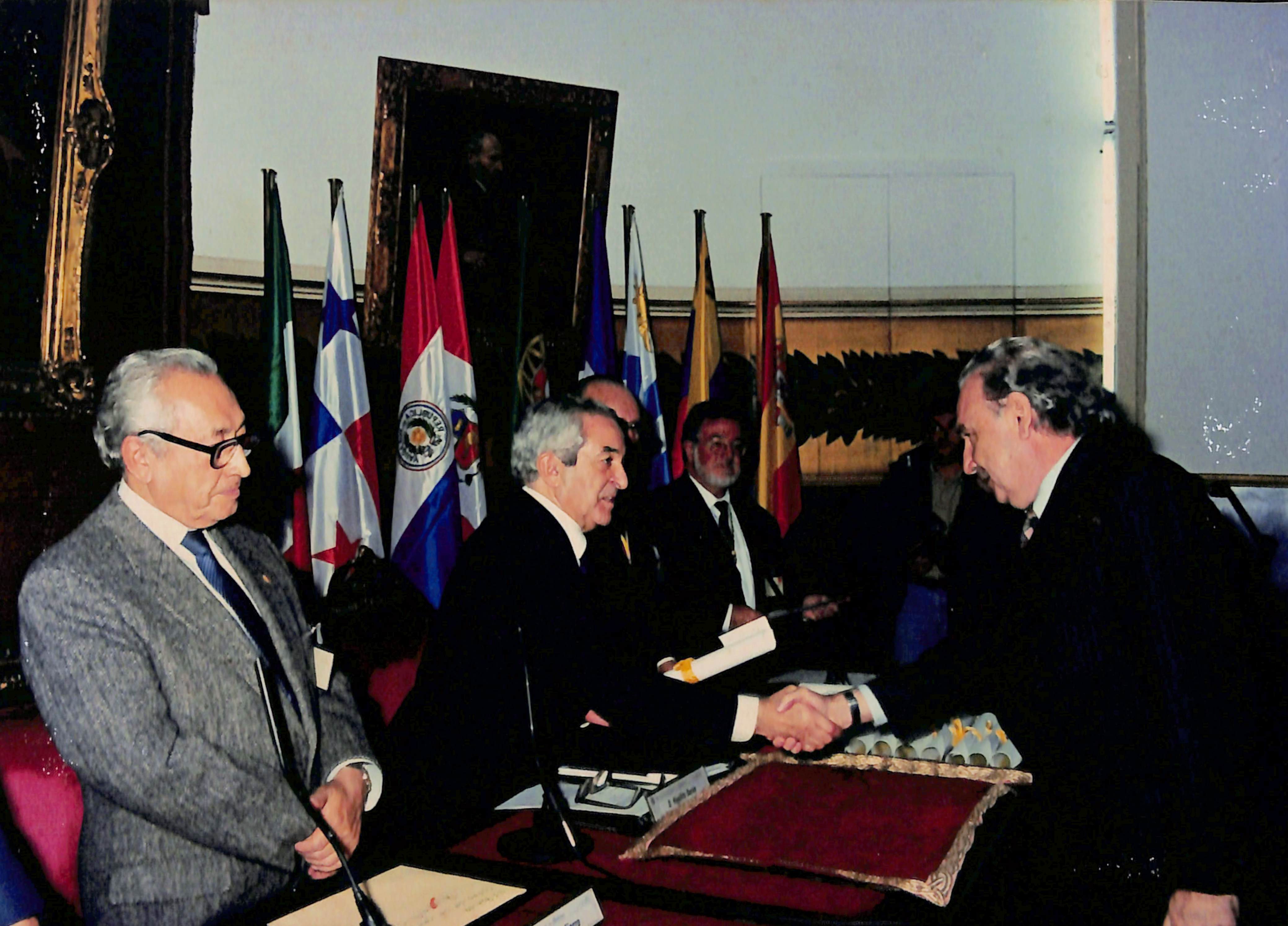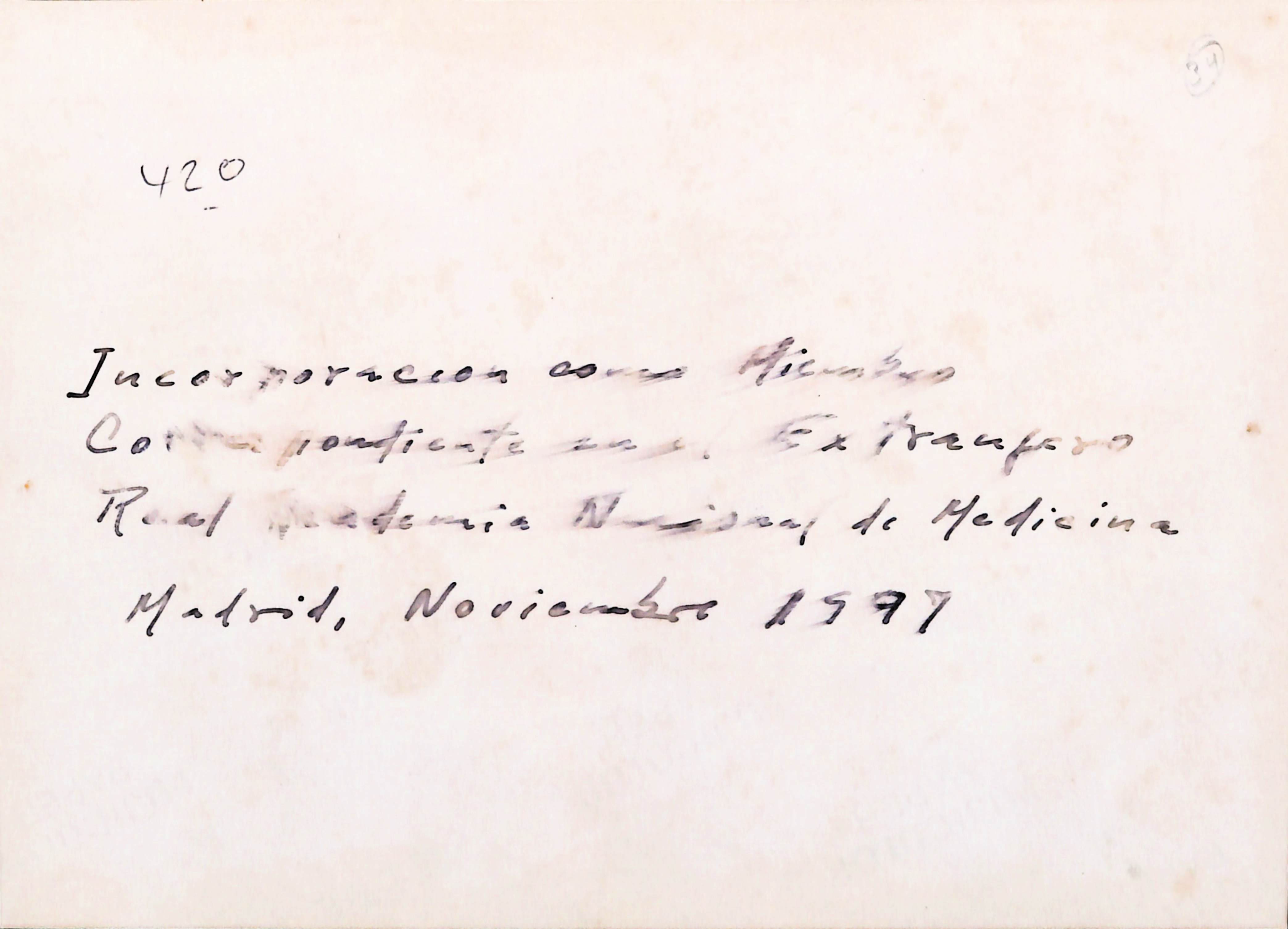 Foto en la que se reconoce a los Dr. Hipólito Durán Sacristán y Dr. Roger Guerra García en la ceremonia de incorporación a la Real Academia Nacional de Medicina. En el reverso de la foto señala incorporación como miembro correspondiente en el extranjero. Real Academia Nacional de Medicina. Madrid, noviembre de 1997