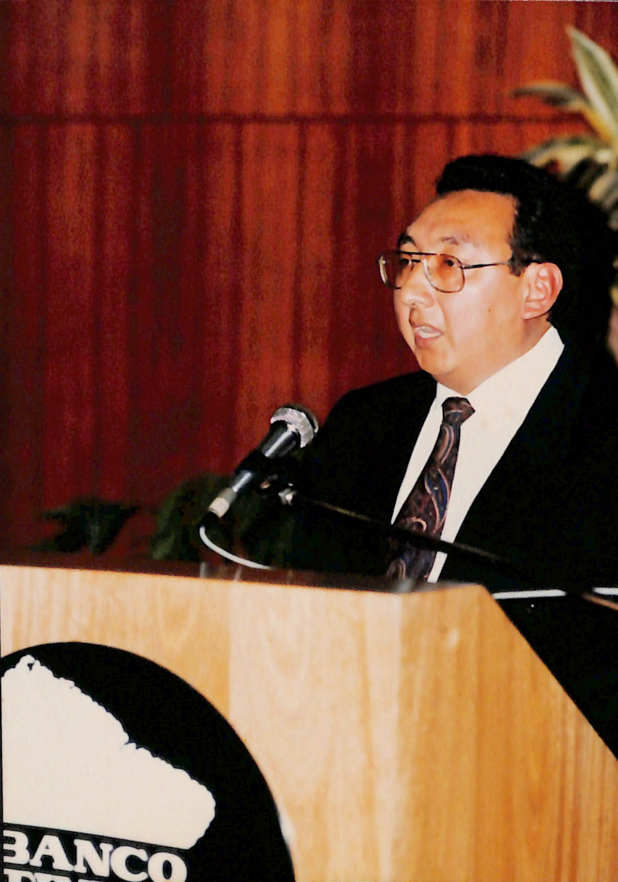 En la fotografía se aprecia al Dr. Gustavo Gonzales de pie dando un discurso después de ganar el premio Rousel.
