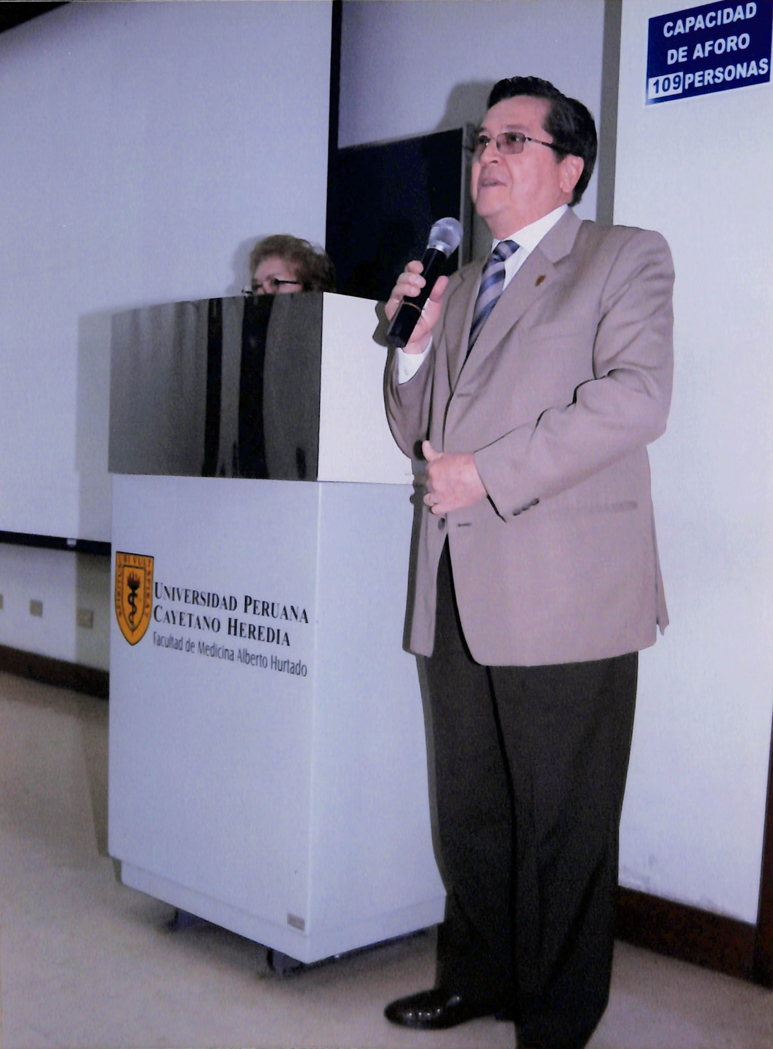 Dr. Eduardo Barriga dando un discurso en el marco del XXV Aniversario del fallecimiento del Dr. Alberto Hurtado, en la Facultad de Medicina de la Universidad Peruana Cayetano Heredia