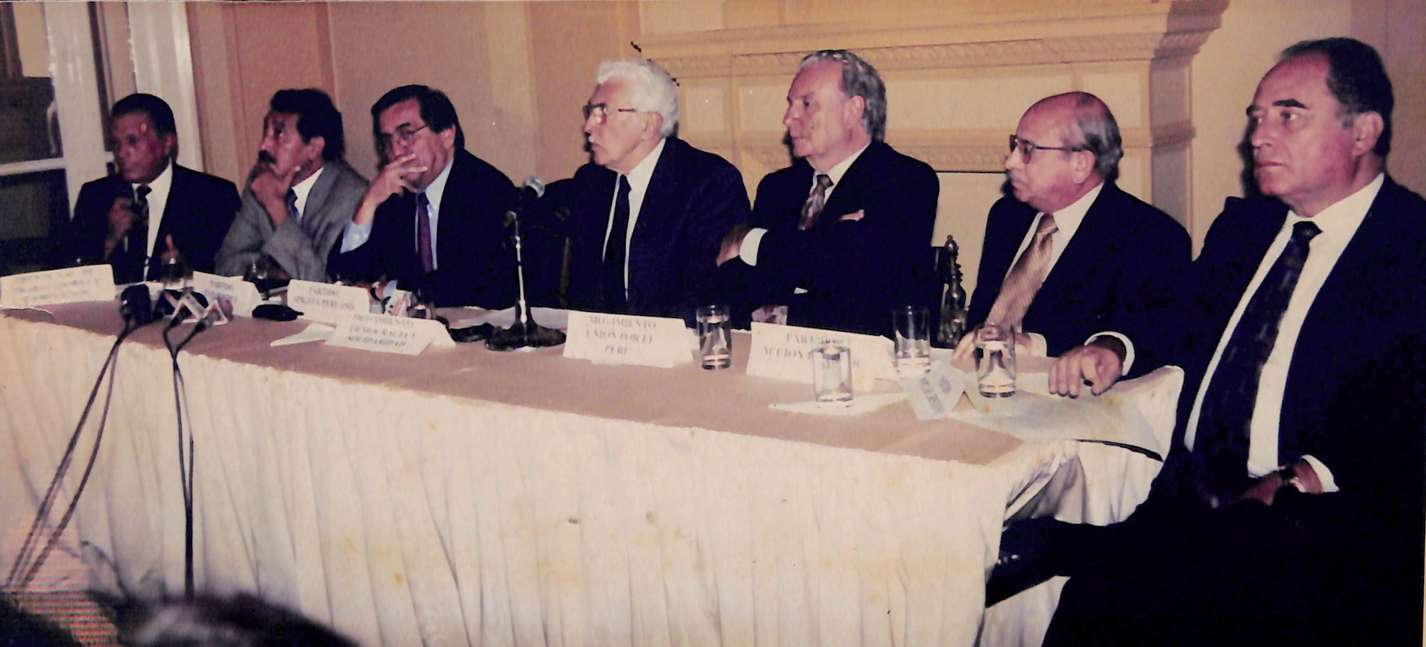 En la fotografía se aprecia a varios representantes de partidos políticos y de derecha a izquierda sentado en tercer lugar el Dr. Roger Guerra García,y en quinto lugar a Jorge del Castillo. En el reverso señala: reunión en el Hotel Bolivar, abril 1999.