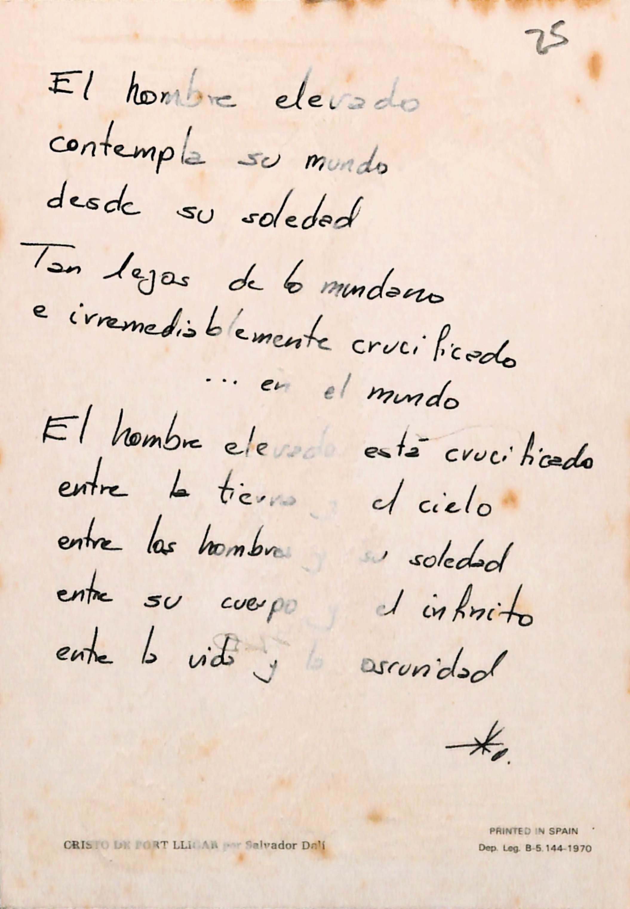 Postal que indica: El hombre elevado contempla su mundo desde su soledad. Tan lejos de lo mundano e irremediablemente crucificado… en el mundo. El hombre elevado está cricificado entre la tierra y el cielo entre los hombres y su soledad entre su cuerpo y el infinito entre la vida y la oscuridad.
