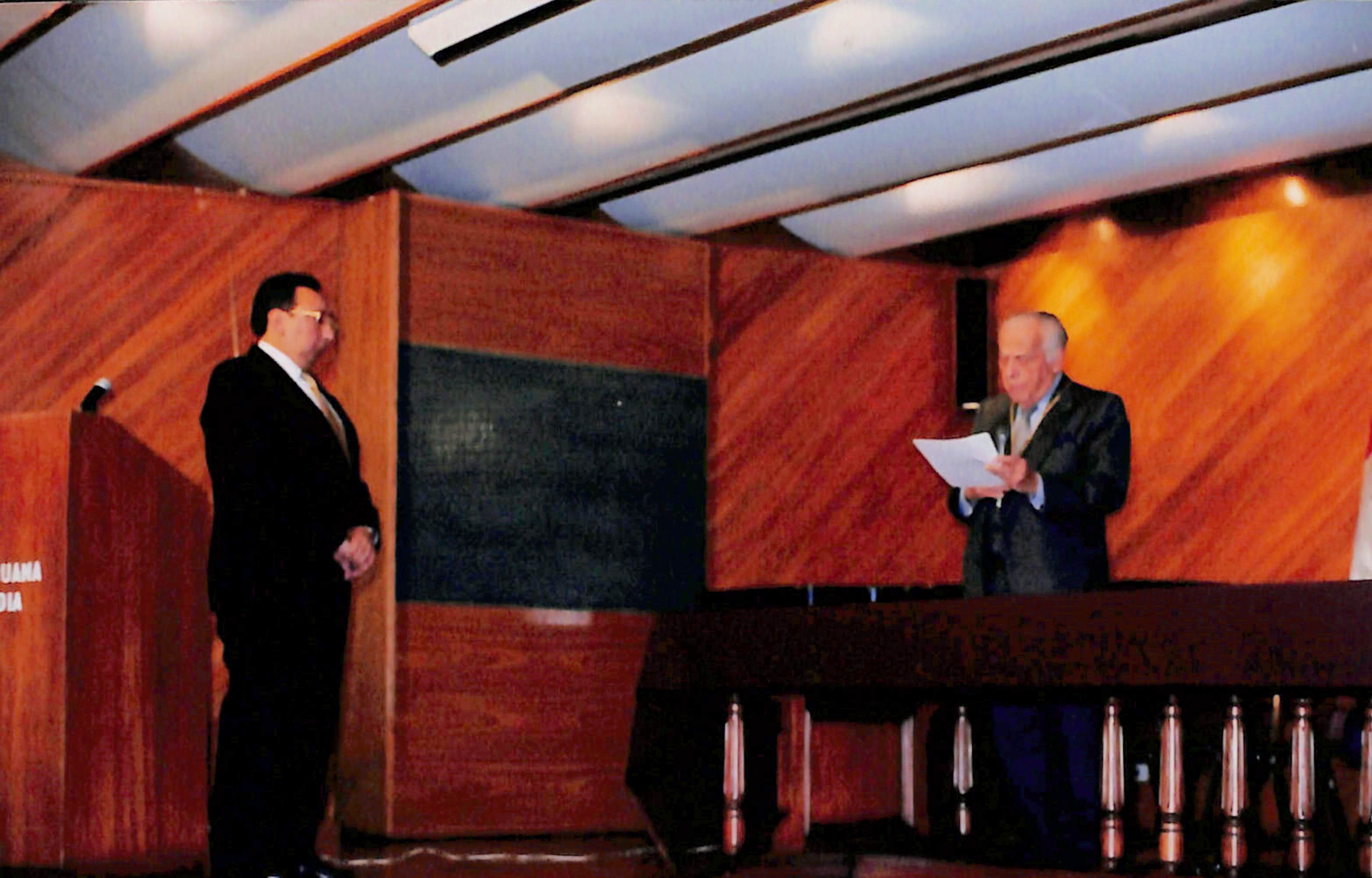 En la fotografía se puede reconoceral Dr. Vasi Paez de pie dando un discurso, en la ceremonia de incoorporación a la Incorporación a la Academia Nacional de Medicina del Dr. Gustavo Gonzales