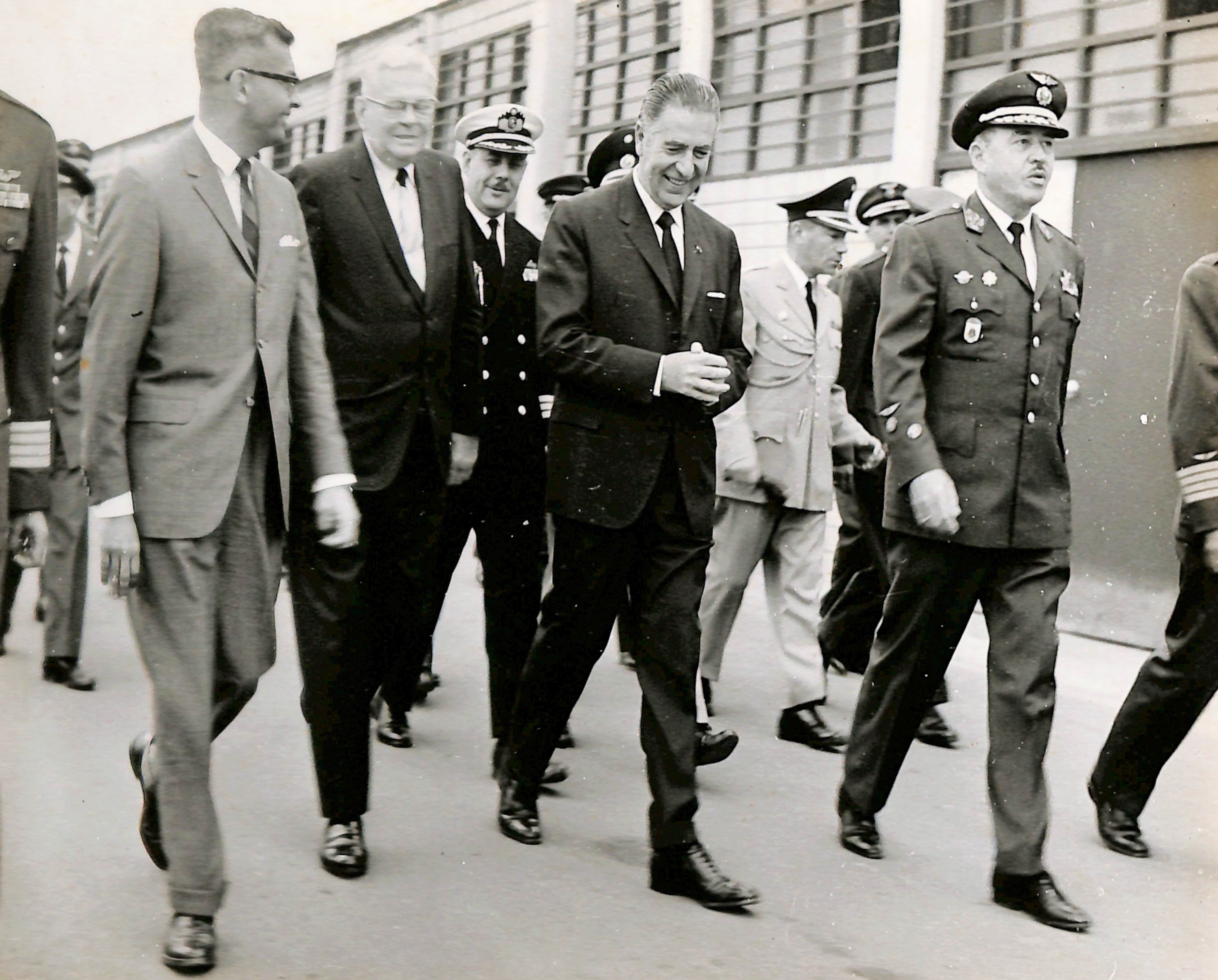 En la fotografía se aprecia caminando de izquierda a derecha al Dr. Arias Stella, Helmut W. Kessel y Fernando Belaunde Terry, presidente del Perú.