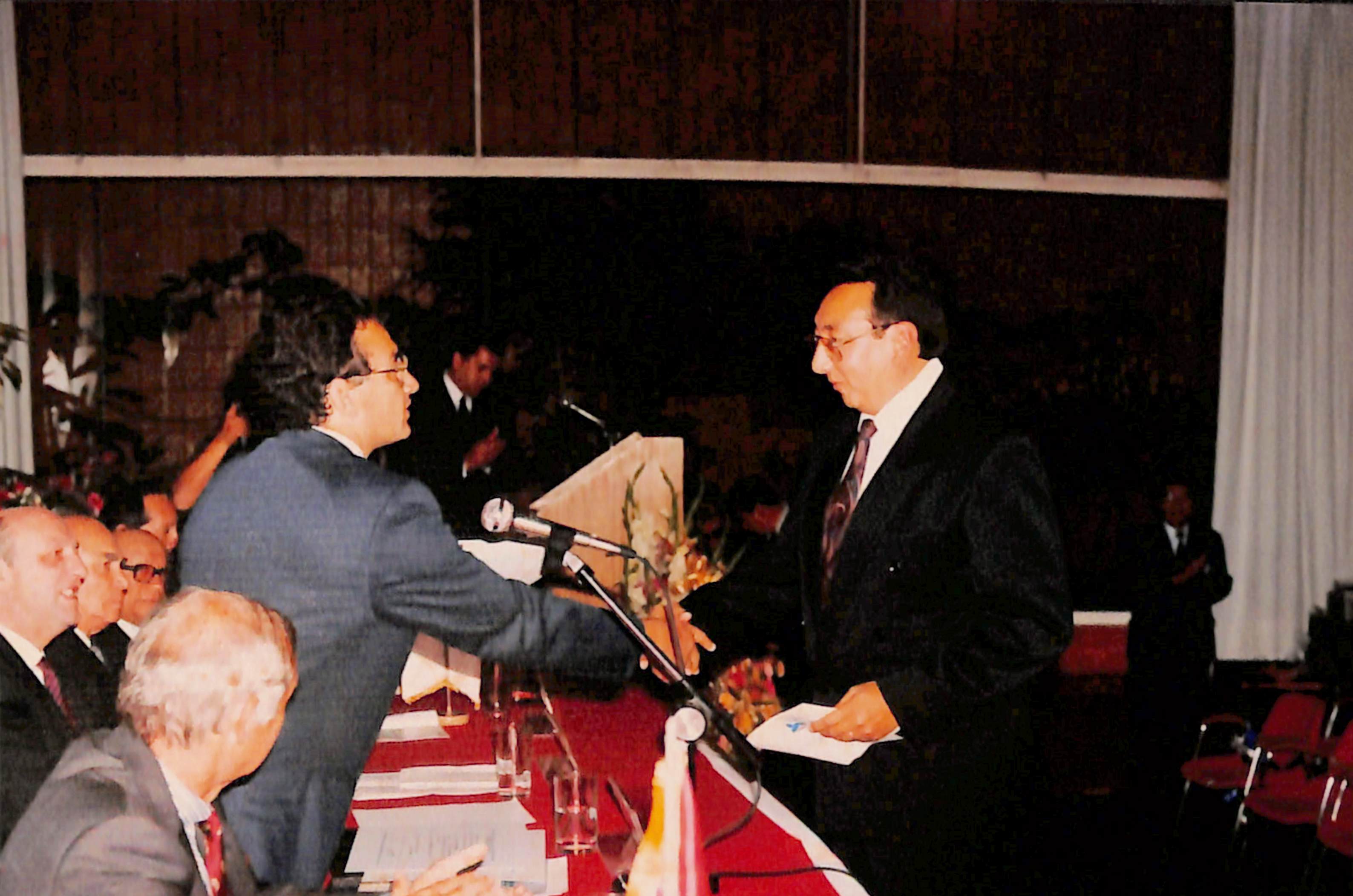 El Dr. Gustavo Gonzales en la premiación del Premio Roussel saludando al Dr. Alejandro Aguinaga.