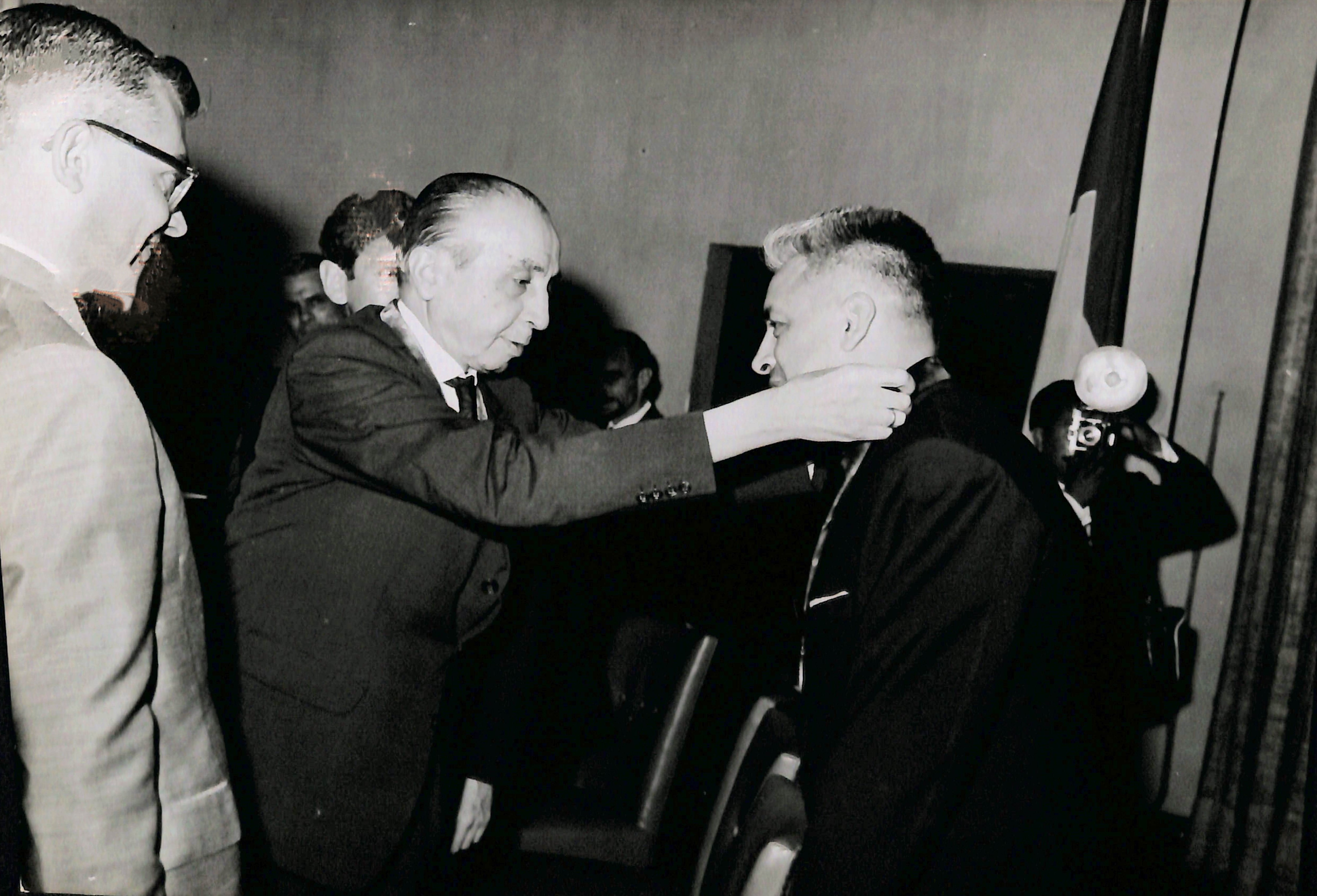 En la fotografía se aprecia al Dr. Honorio Delgado entregando una medalla, a su lado derecho se aprecia de perfil al Dr. Javier Arias Stella.