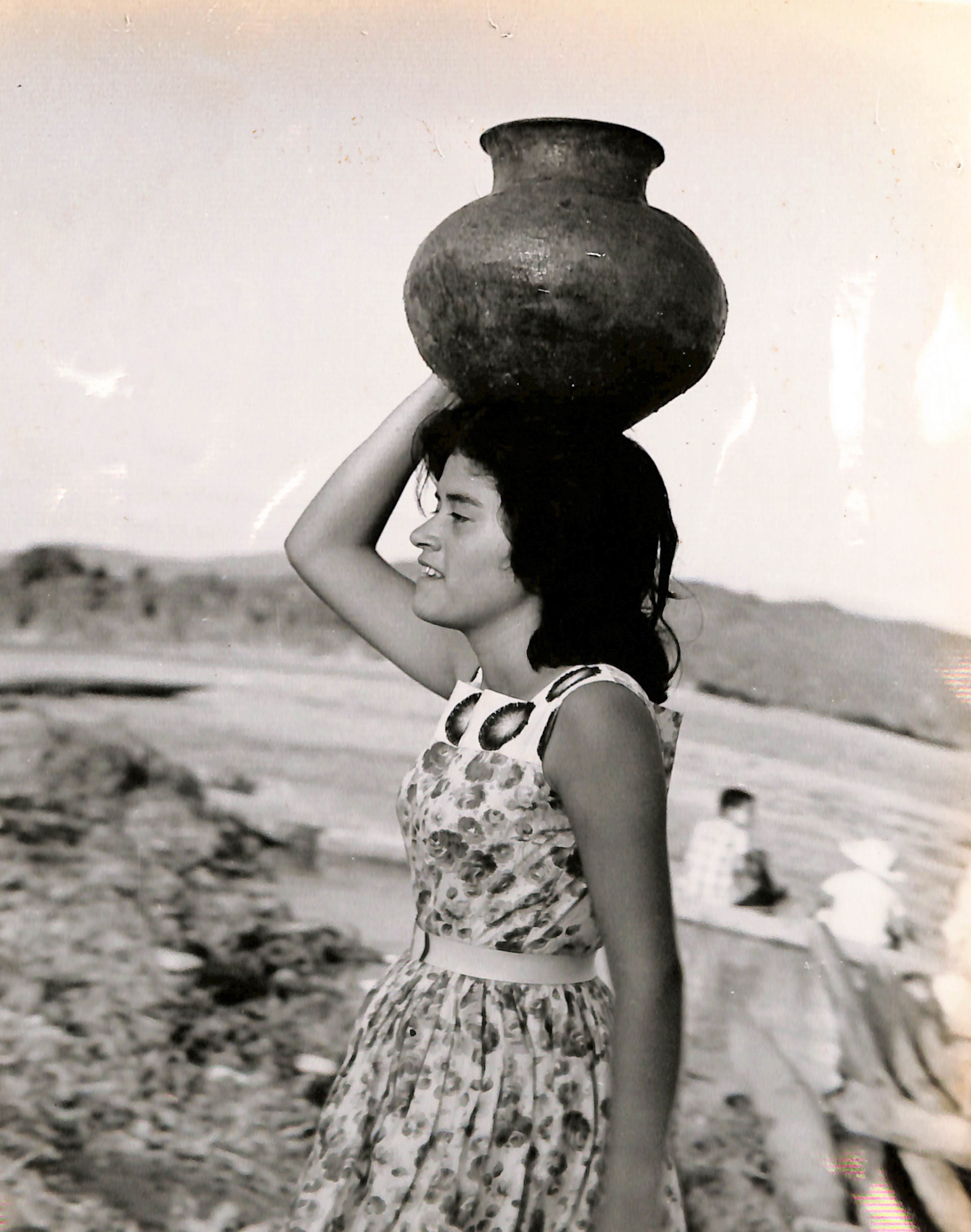 En la fotografía se aprecia una joven mujer de perfil cargando una vasija.