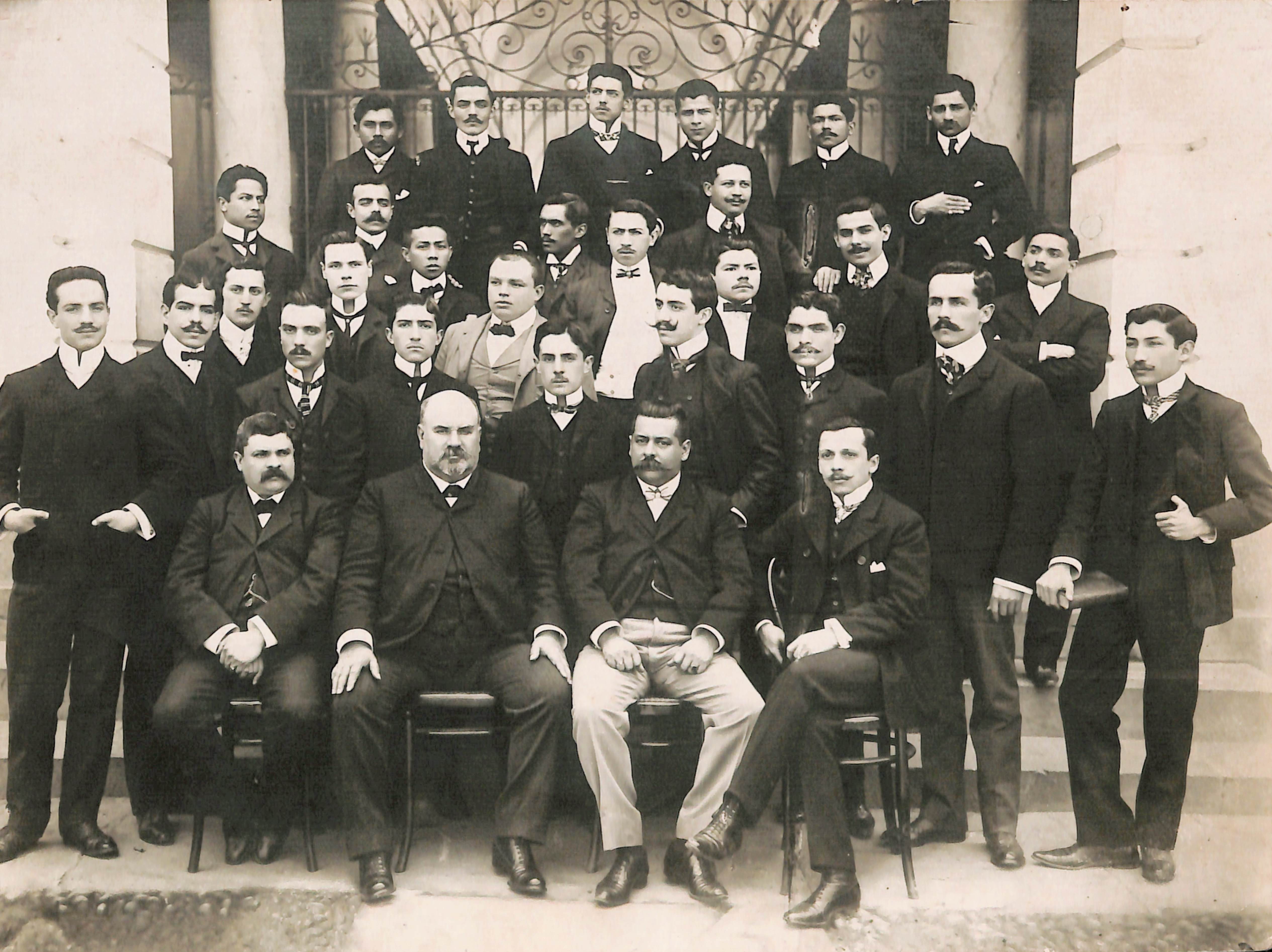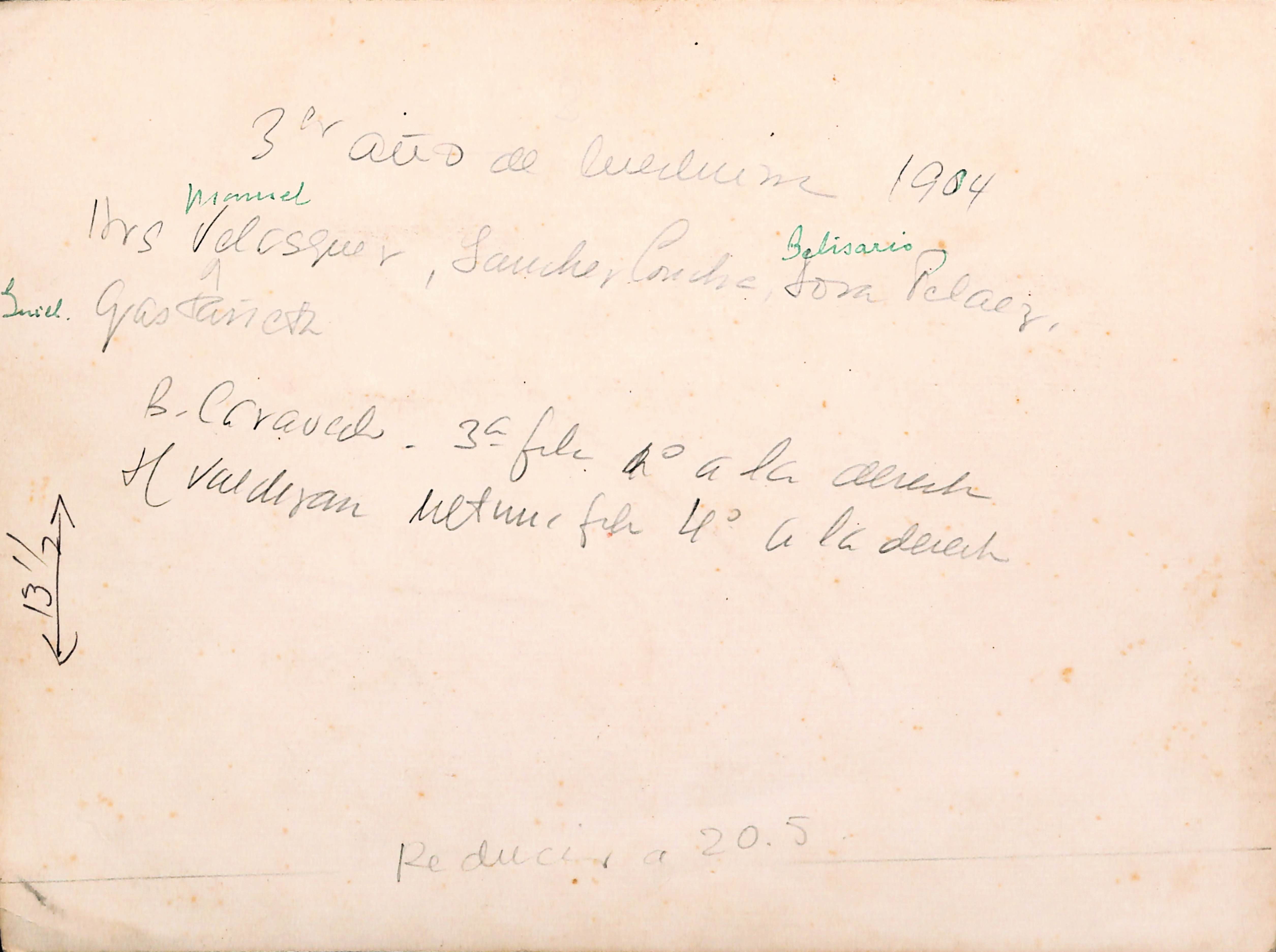 En la fotografía se aprecia a un grupo de estudiantes en el frontis de la Facultad de Medicina de San Marcos. En el reverso indica, : Tercer año de Medicina 1904. Drs. Manuel Velásquez, Laucher Concha, Belisario Lora Peláez, Daniel Gastañeda. Baltazar Caravedo - Tercera fila a la derecha, Hermilio Valdizan última fila cuarta a la derecha.