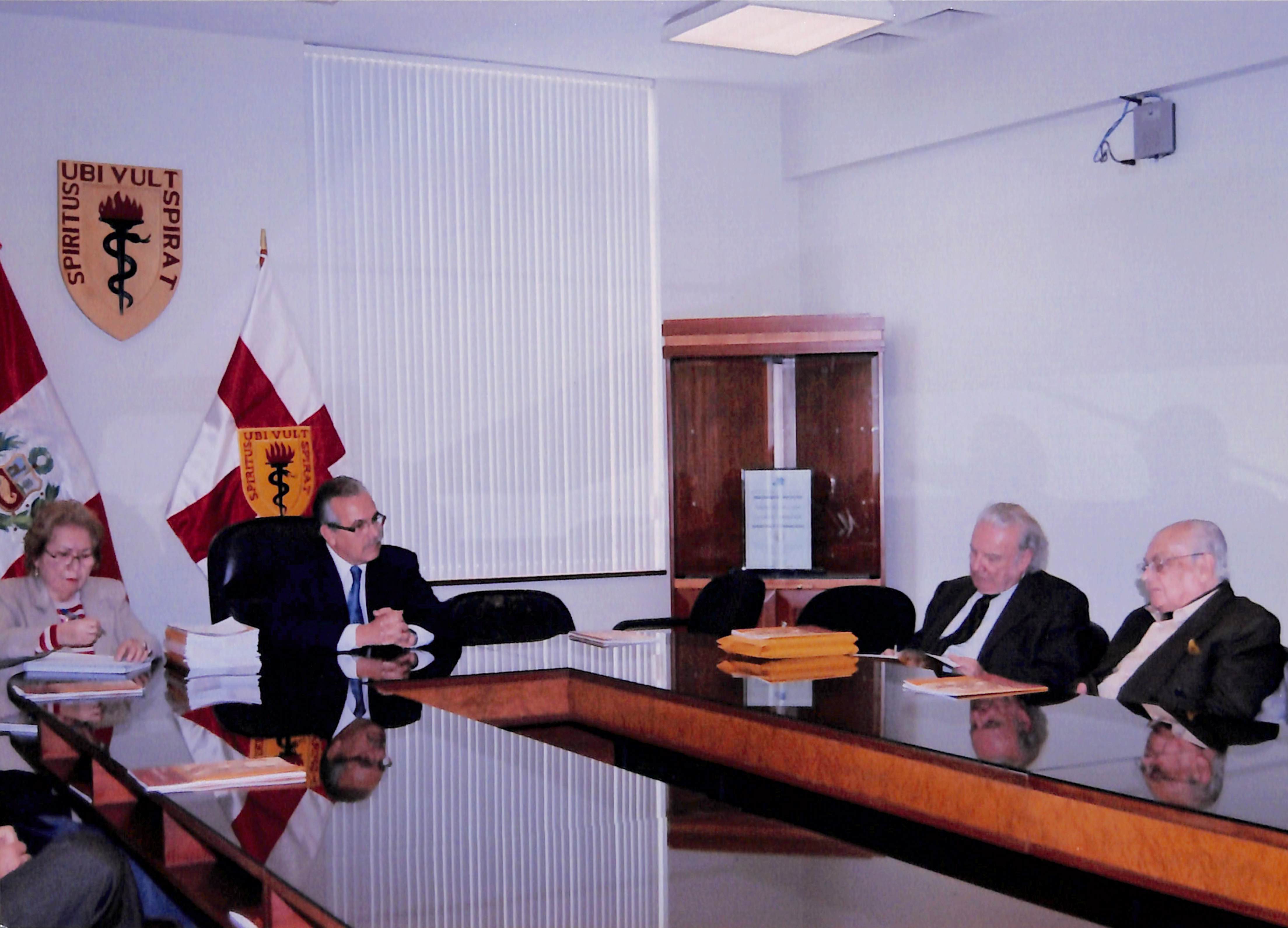 De derecha a izquierda: Dr. Luis Caravedo Reyes, Dr. Roger Guerra-García y el Dr. Milenko Zlata, en el salón de reuniones del decanato de la Facultad de Medicina de la Universidad Peruana Cayetano Heredia.