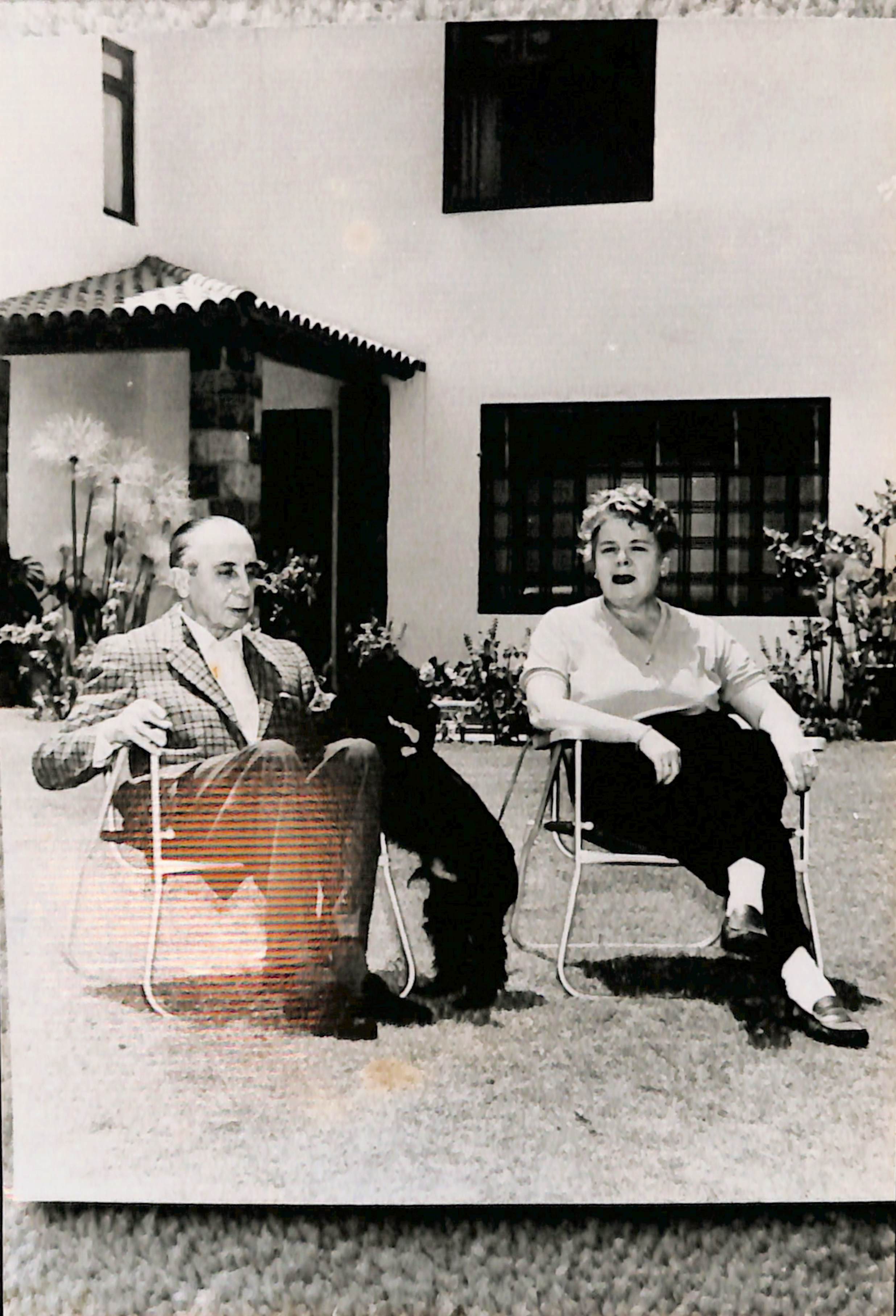 Dr. Honorio Delgado en el jardín de su casa en Santa Clara, junto a su esposa Helene Rehe y su mascota "Pentapolin".