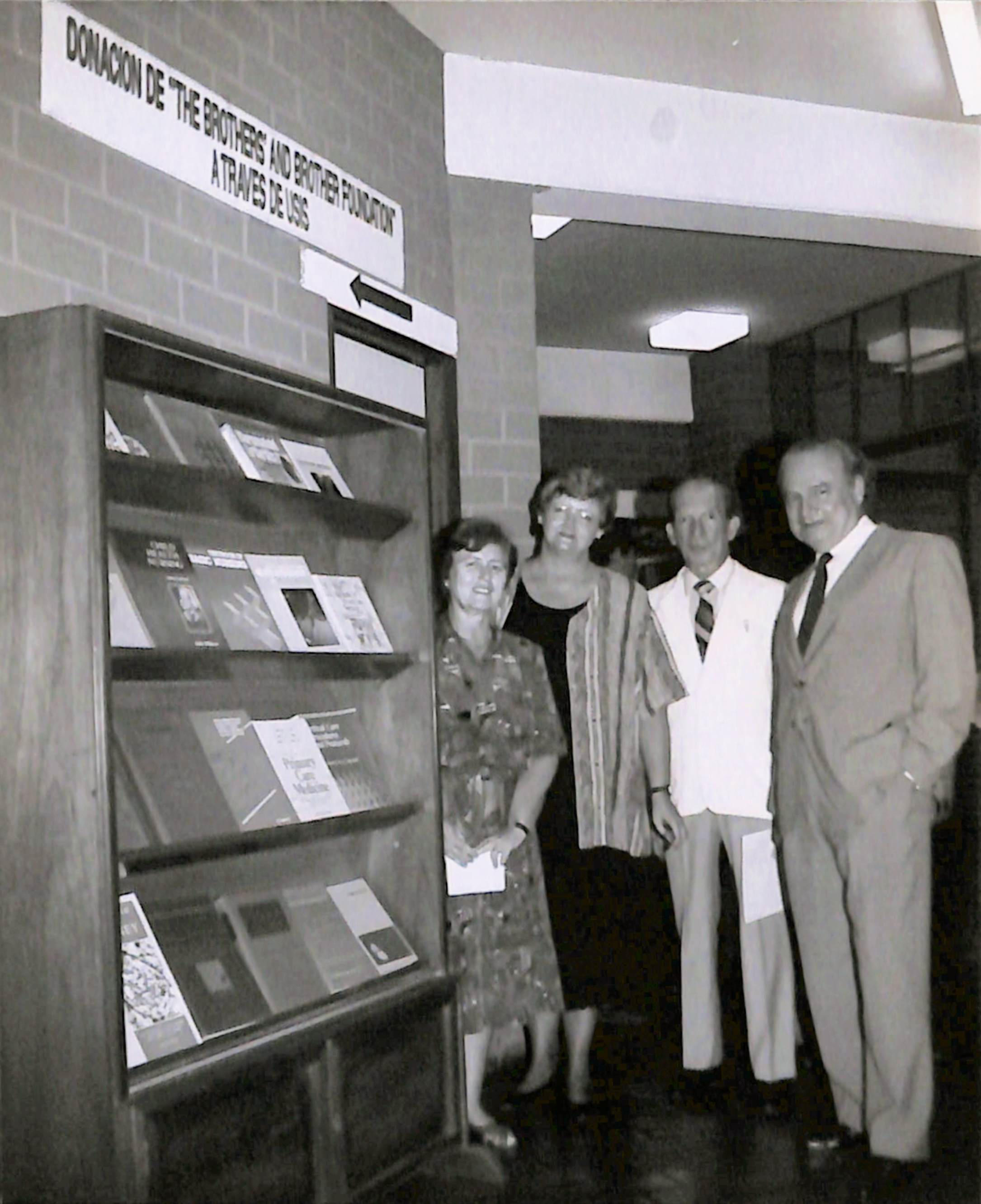 Donación de libros de "The Brothers and Brothers Fundation" a través de USIS. De derecha a izquierda el Dr. Roger Guerra García, rector de la Universidad Peruano Cayetano Heredia, Dr. Naldo Balarezo, Jefe de Biblioteca y la cuarta en la foto es Graciela Risco de Domínguez, Vicerrectora académica.