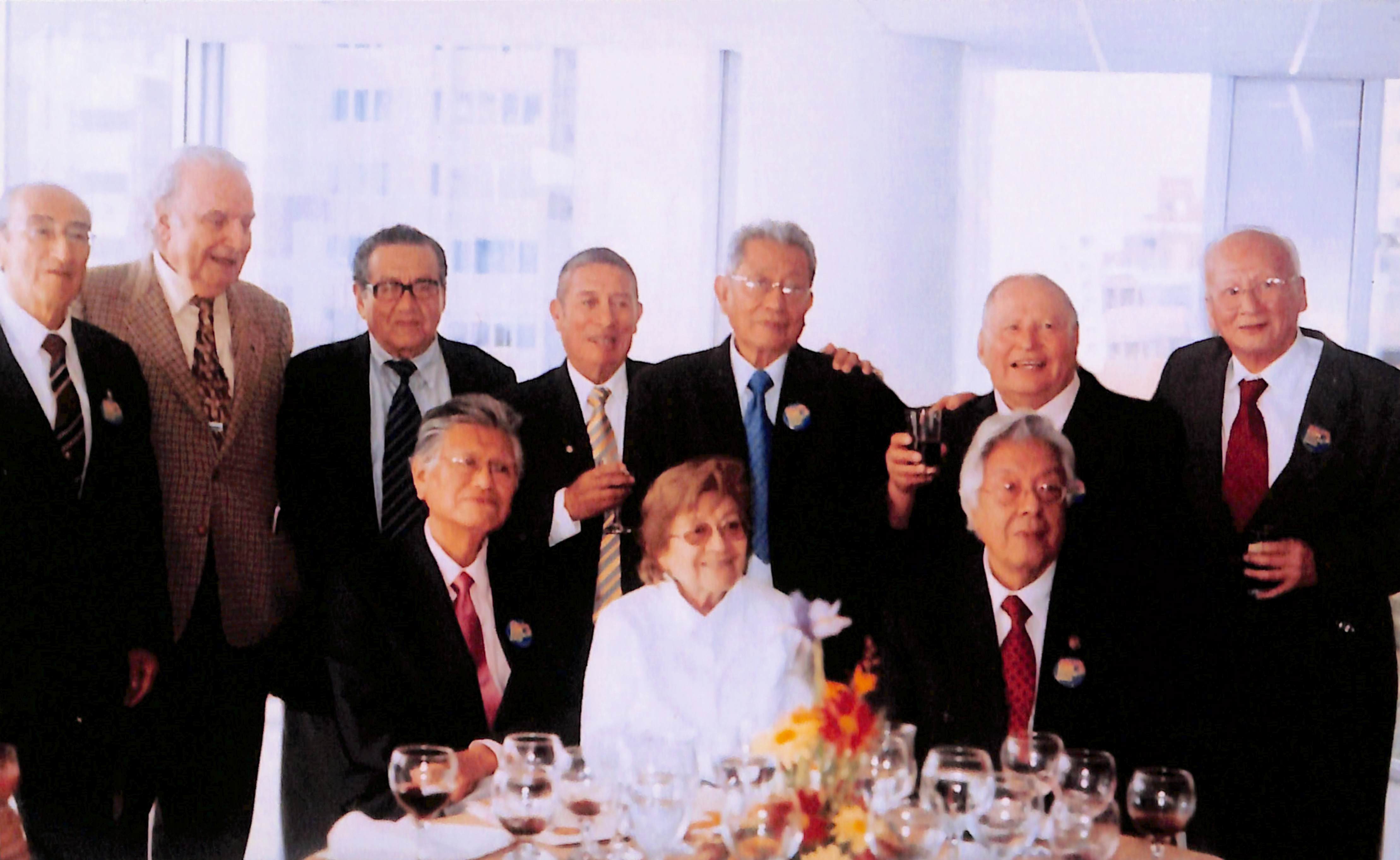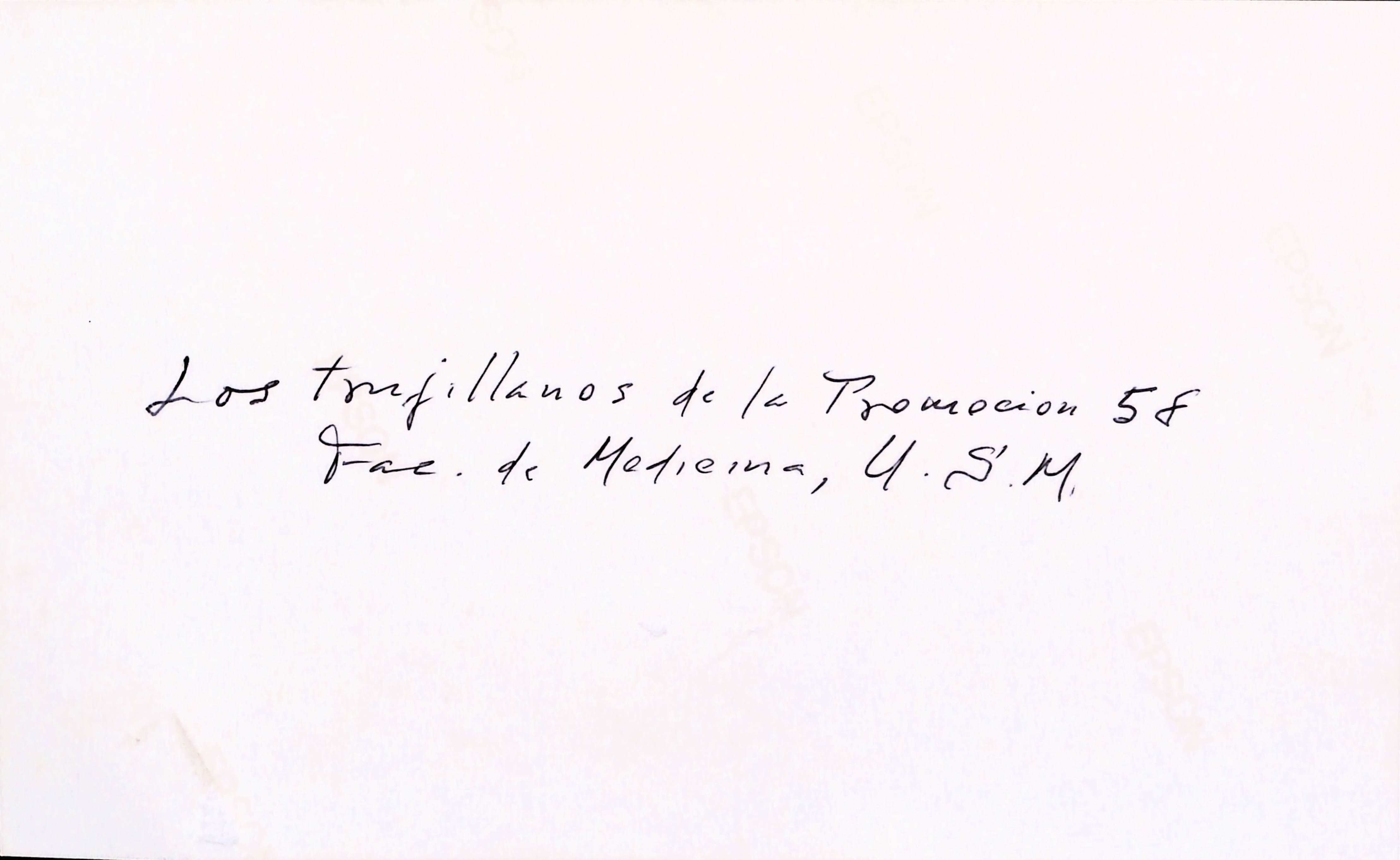 En el reverso lleva escrito: "los trujillanos de la promoción 58, Fac. de Medicina, USM." En la hoja que acompaña la foto señala: "Los estudiantes que venimos de la U de Trujillo, 50 años después."