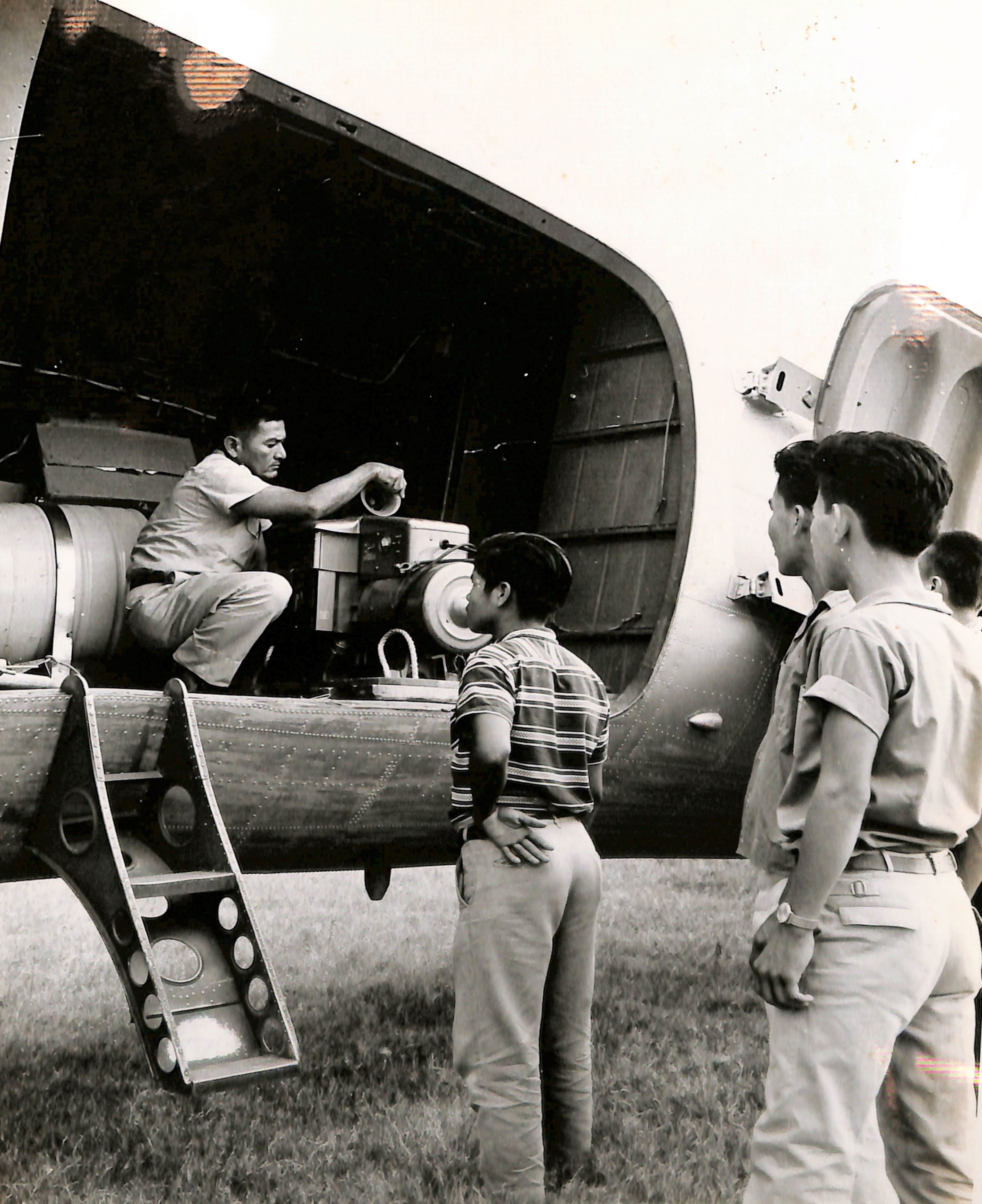 En la fotografía se aprecia al personal alistando el dínamo de fuerza eléctrica del avión dispensario.
