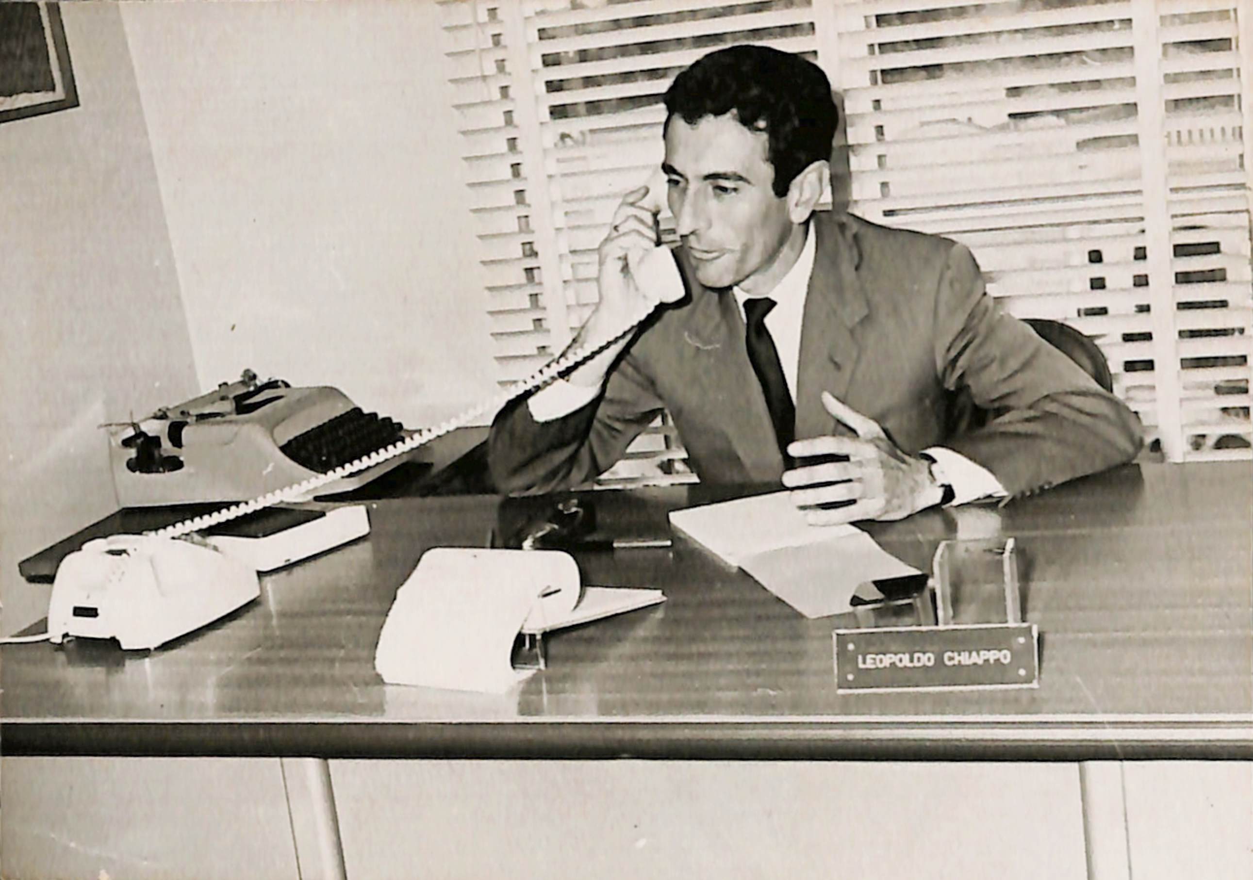 En la fotografía se aprecia a Leopoldo Chiappo en primer plano, sentado en su oficina hablando por teléfono.