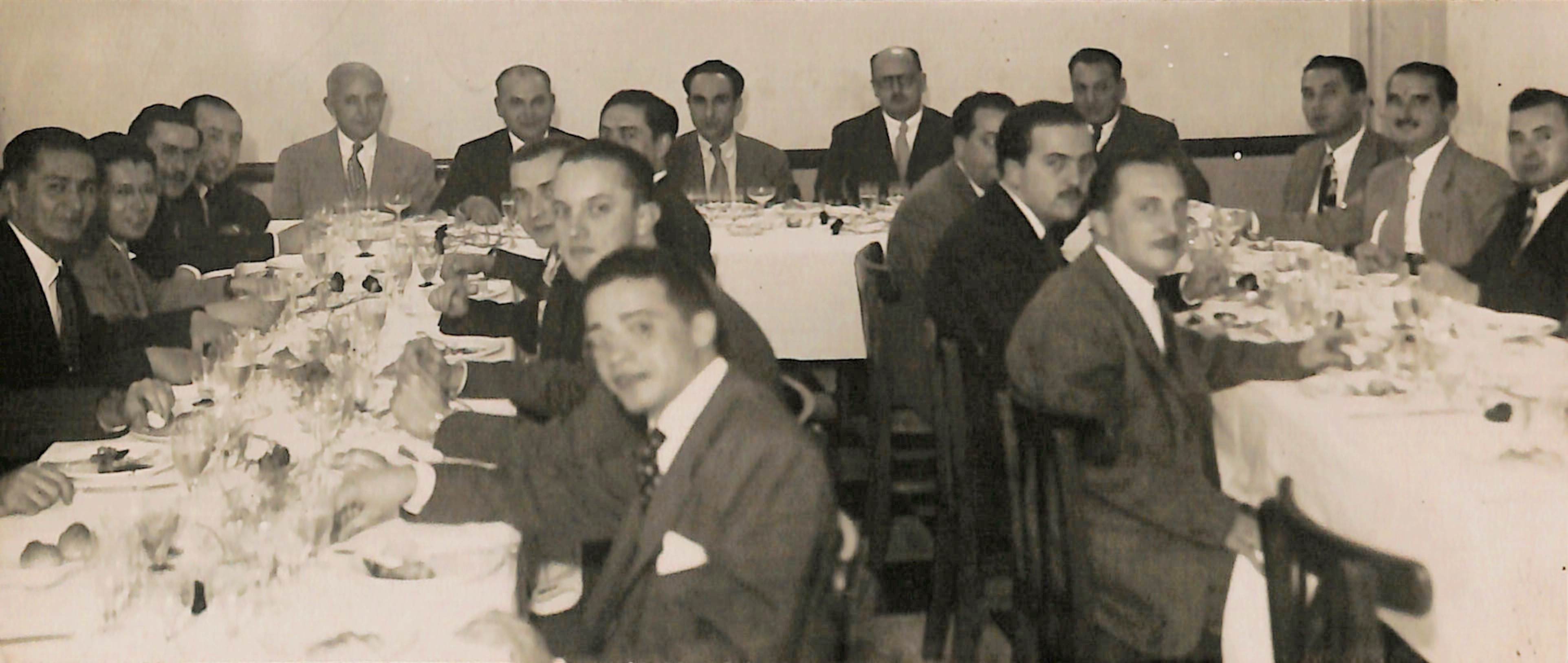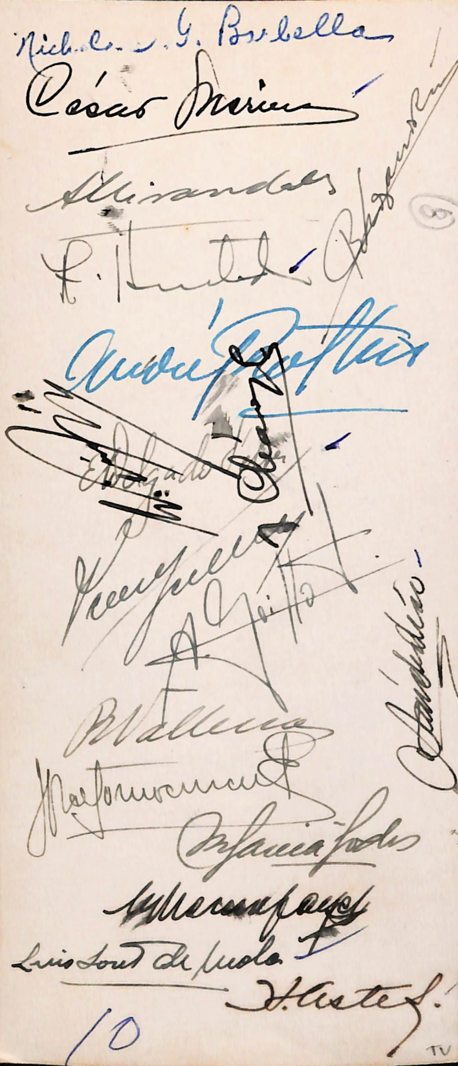 Fotografía de una reunión en la que podemos reconocer al Dr. Alberto Hurtado y Dr. Humberto Aste. En el reverso se encuentra las firmas de varios médicos.
